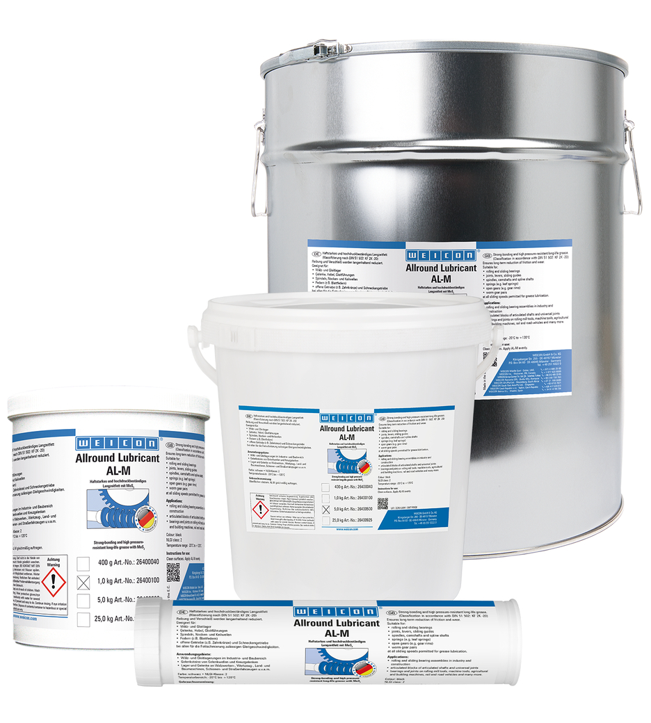 WEICON AL-M uzun süreliğine sürtünme ve aşınmayı azaltır. Rulmanlı ve kaymalı yataklar, birleşme yerleri, kumanda kolları, kayıcı kılavuzlar, dingiller, kam milleri, frezeli miller, yaylar, açık dişliler, salyangoz dişliler ve gres yağı için verilen tüm kayma hızlarında uygundur.