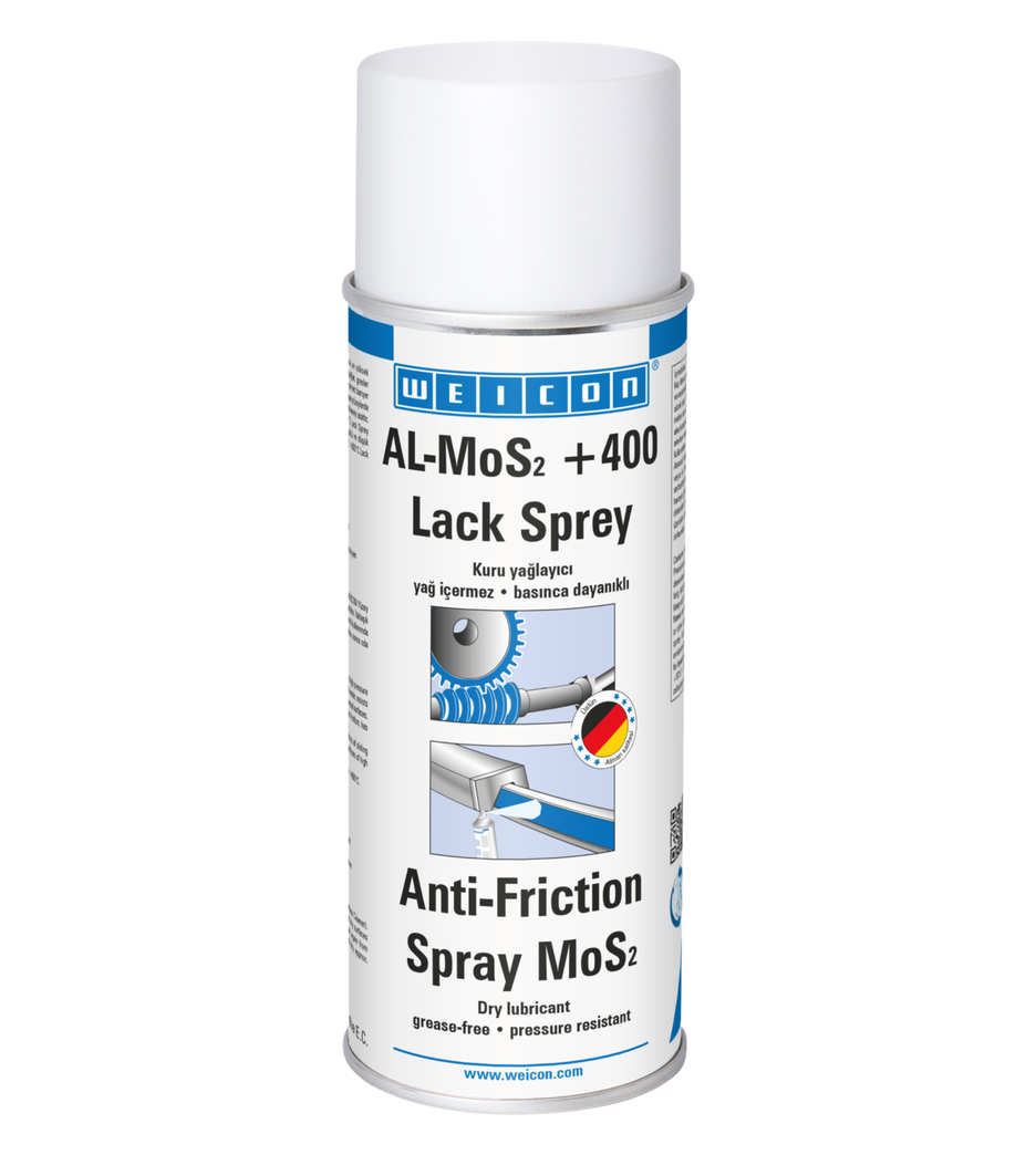 AL- MoS2 + 400 Lack Sprey -200 ile +450 kısa süreli ile +500 arası basınç ve sıcaklık dayanımlı gres içermeyen kuru yağdır. Tabaka tozu, kiri ve suyu atar ve yağa, grese ve pek çok kimyasala dayanıklıdır. Metal, plastik ve ahşap yüzeylere yapışır. MoS2’nin yüksek oranı temiz kaygan yağlama sağlar, sürtünmeyi azaltır, harika acil çalışma özellikleri vardır ve çalışma seslerini azaltır. WEICON AL- MoS2 + 400 Lack Sprey sürgülü yataklar, dişli tertibatları ve Diğerleri sürgü eşleşmeleri için özellikle de yüksek basınç yükü ve düşük kayma hızında kayma koşullarını kısaltır ve geliştirir. WEICON AL- MoS2 + 400 Lack Sprey kayıcı ve çalışan raylarda ve kılavuzlarda, konveyör kayışlarında, taşıma röleleri ve sürgülerinde kesim için kaplama olarak, yükleme teknoloji ürünlerinde silikon içeren ayırıcıların ve yağ veya gres yağına izin verilmeyen ya da istenmeyen durumlarda yedek olarak kullanılmaktadır. AL- MoS2 +400 Lack Sprey X-ışınlarına ve lazer ışınlarına dayanıklı.