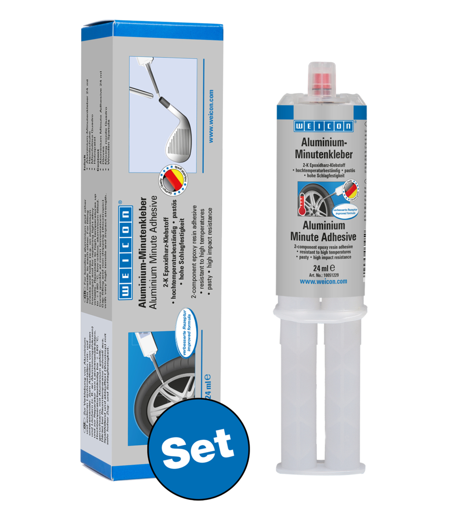 Alüminyum ve diğer hafif metalleri birbirine yapıştırmak için kullanılan yapıştırıcı. WEICON Alüminyum Dakikalık Yapıştırıcı, alüminyum gövdelerdeki çatlakları, delikleri ve hafif alaşım jantları onarmak için idealdir. Alüminyum Dakikalık Yapıştırıcı düşük kokulu, iki bileşenli, alüminyum dolgulu bir epoksi yapıştırıcıdır. 180°C'ye kadar yüksek sıcaklıklara dayanıklıdır ve oda sıcaklığında hızla kürlenir. Kürlendikten sonra yapıştırıcı işlenebilir (eğelenebilir, delinebilir, frezelenebilir). Alüminyum Dakikalık Yapıştırıcı boşluk doldurucu ve sarkmaya dayanıklı (tiksotropik) olup, çok yüksek çekme ve darbe dayanımına sahiptir. Optimum yapışma elde etmek için, yapıştırılacak yüzeyler kuru olmalı ve yağ veya kirden arındırılmış olmalıdır. Temizlemeden önce yüzeyin kazınması veya zımparalanması iyi bir yapışma sağlamaya yardımcı olur.
