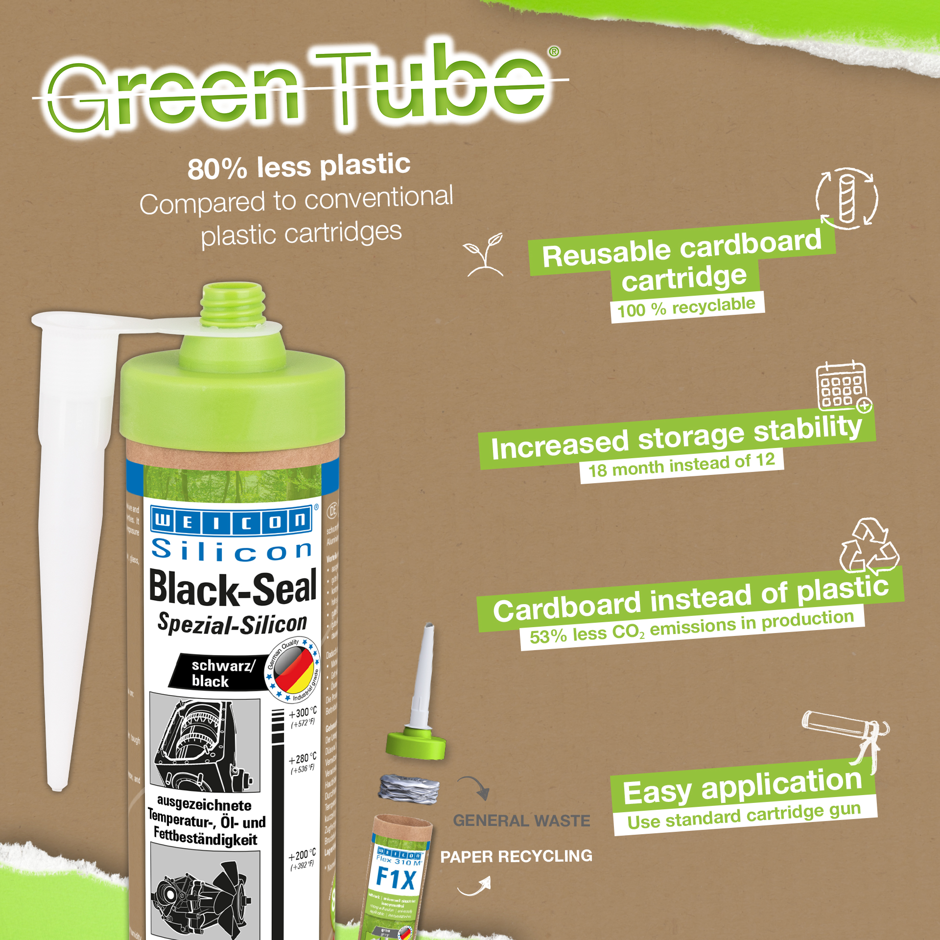 WEICON Black - Seal yapıştırıcı ve sızdırmazlıkmalzemesi siyahtır, yüksek sıcaklıklara dayanıklıdır (+280 °C/+536 °F), solvent içermez, güçlüdür, yağ, gres ve basınç dirençlidir, yıpranmaya dayanıklıdır ve aşırı elastiktir (kopma uzaması yaklaşık %500).