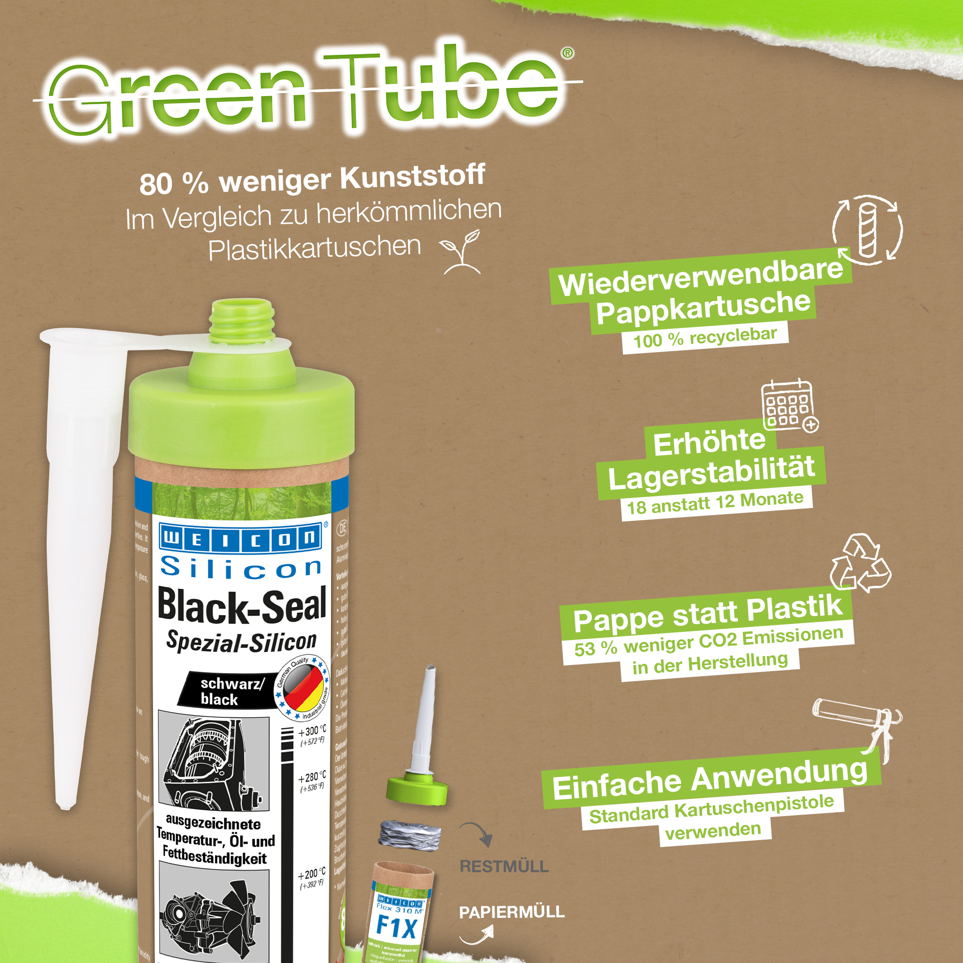 WEICON Black - Seal yapıştırıcı ve sızdırmazlıkmalzemesi siyahtır, yüksek sıcaklıklara dayanıklıdır (+280 °C/+536 °F), solvent içermez, güçlüdür, yağ, gres ve basınç dirençlidir, yıpranmaya dayanıklıdır ve aşırı elastiktir (kopma uzaması yaklaşık %500).
