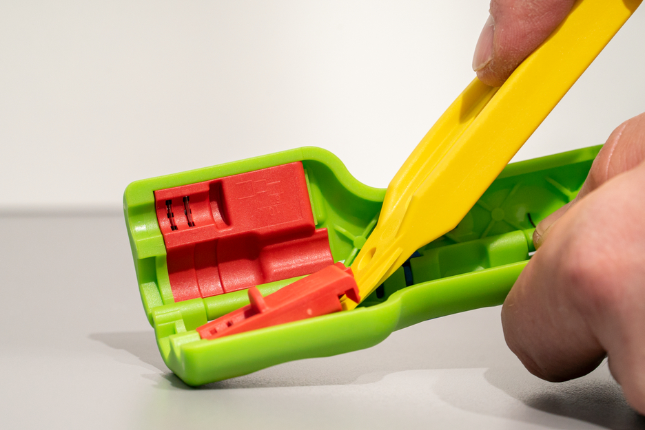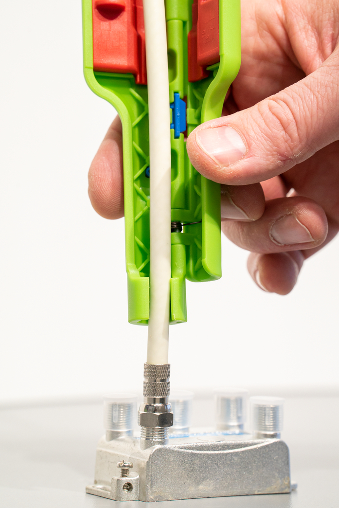 F-vidalı konnektörleri kabloya vidalamak için kavrama çeneleri, 11 mm anahtar boyutuna sahip entegre açık altıgen, F-konnektörlerin yerden tasarruf sağlayan montajı ve demontajı (SW 11), yaygın F-konnektörler (6/4 mm) için uzunluk durduruculu bıçakların ayarı olmadan opsiyonel sıyırma: Tanımlanmış diğer boyutlardaki sıyırmalar için farklı bıçak uçları mevcuttur (örn. sıkıştırma konektörleri: 6.5 / 6.5 mm)