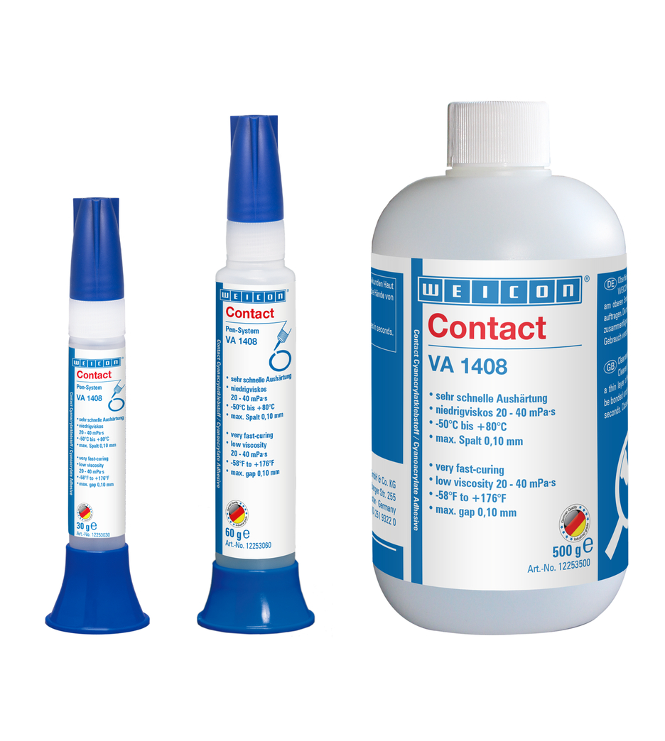 WEICON Contact VA 1408 düşük viskozitelidir (20-40 mPa•s) ve azaltılmış “blum” etkisine sahiptir. Çabuk sertleşir, işleme sırasında hafif kokuludur ve sertleşmeden sonra nem etkilerine daha az hassastır. Ürün çok çeşitli malzemelerin temiz ve göz alıcı yapışması için uygundur.