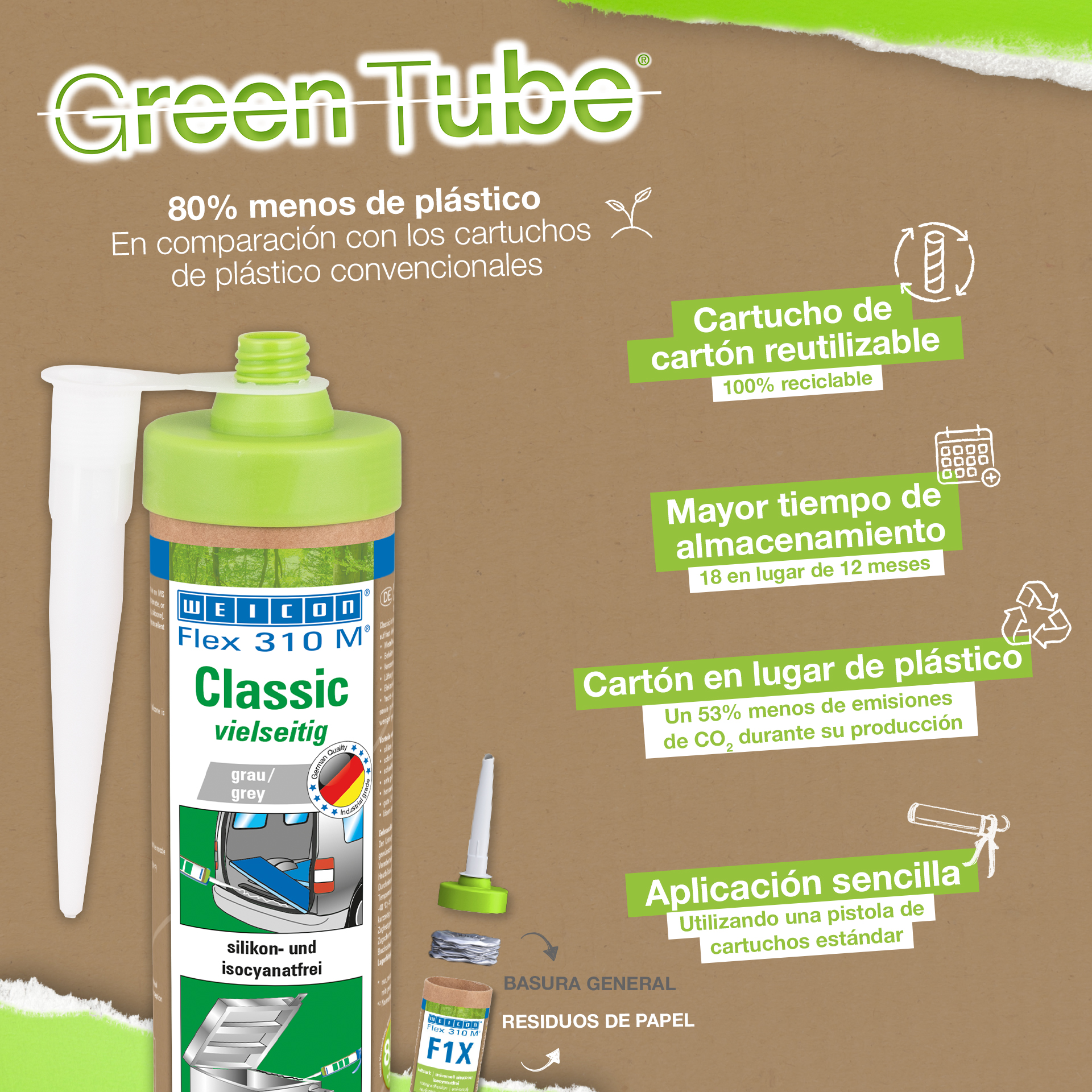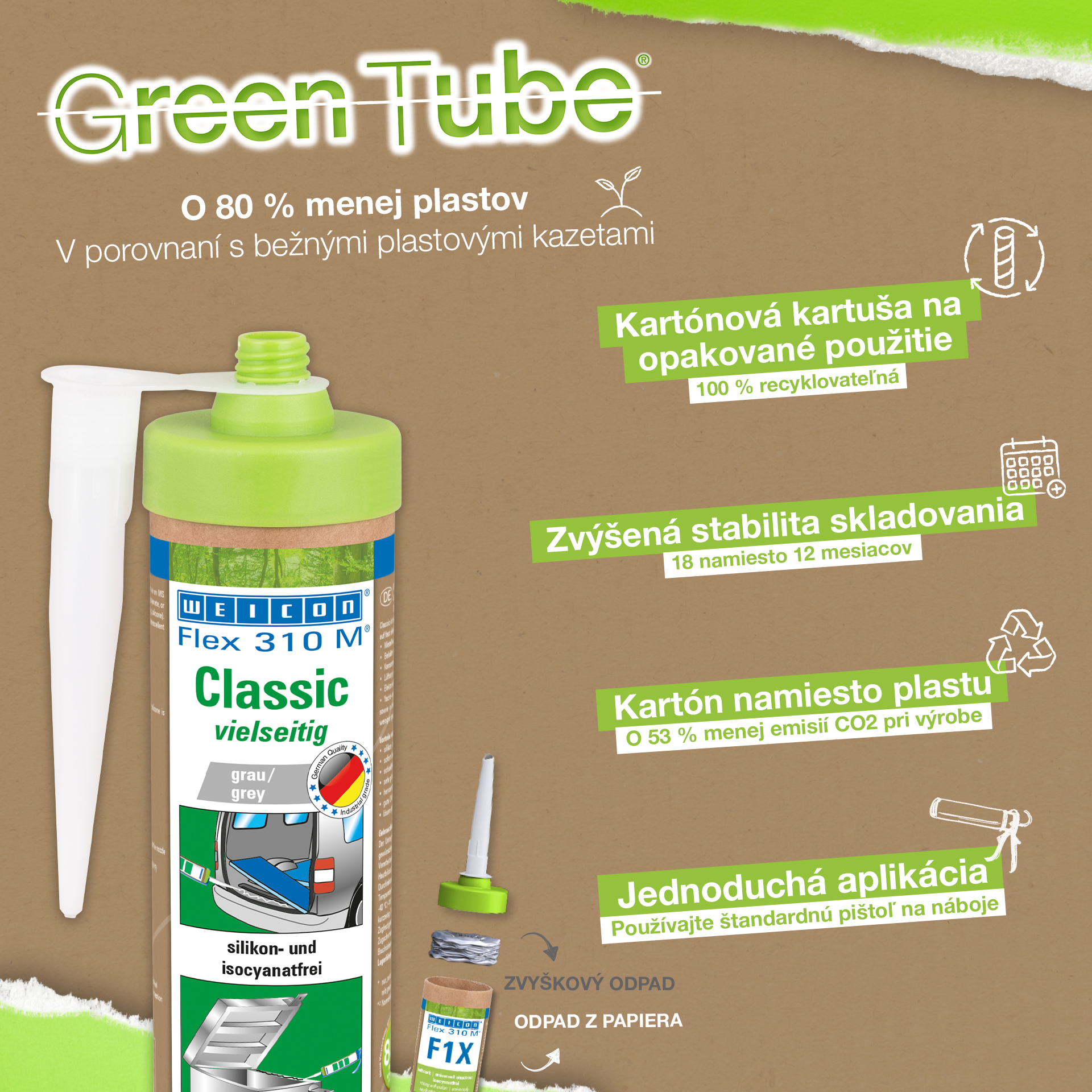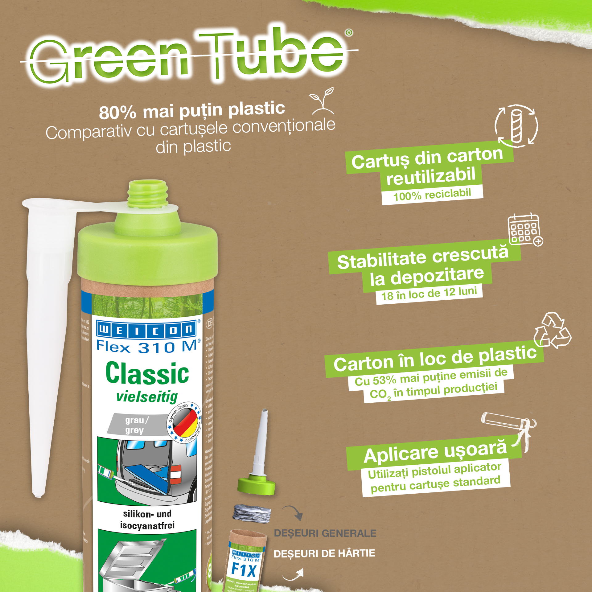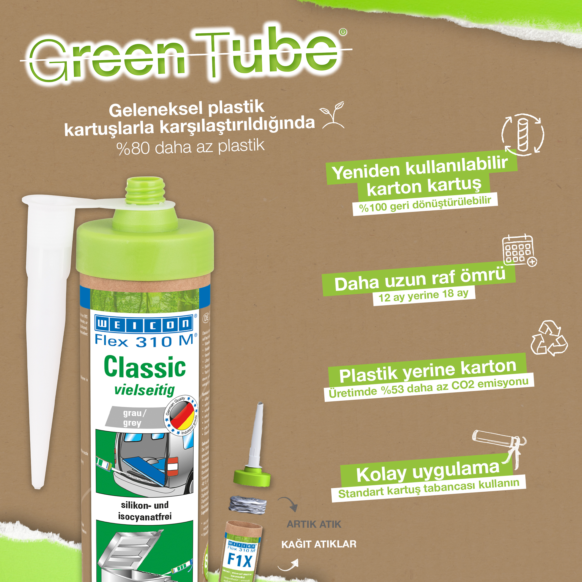 WEICON Flex 310 M Klasik Yapıştırıcı ve Sızdırmazlık Malzemesi güçlüdür, boyanabilirdir (ıslakta ıslak), taşlanabilir, harika bir yıpranma kararlılığına ve UV ışınlarına iyi dirence sahiptir. Tatlı suya ve tuzlu suya dirençlidir, silikon, izosiyanat, halojen ve solvent içermez. Ürün ISEGA onaylıdır ve gıda teknolojisinde yapıştırıcı olarak kullanılabilmektedir. Flex 310 M Klasik polimer temelde klasik elastik yapıştırıcıdır ve metaller, pek çok plastikler, seramik, ahşap, cam ve taş için uygundur. WEICON Flex 310 M Klasik metal yapımında, tank ve aparat mühendisliğinde, taşıt, araç ve konteyner yapımında, havalandırma ve klima sistemlerinde, elektrik endüstrisinde, yat ve tekne yapımında ve silikon içeren ürünlerin uygun olmadığı tüm uygulamalarda kullanılır.
