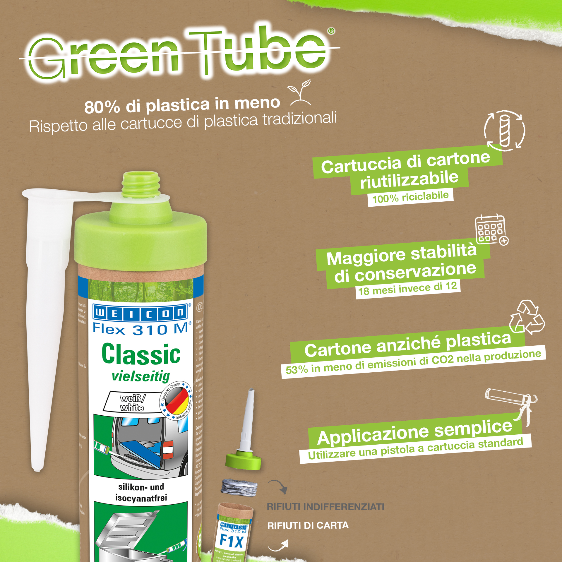 WEICON Flex 310 M Klasik Yapıştırıcı ve Sızdırmazlık Malzemesi güçlüdür, boyanabilirdir (ıslakta ıslak), taşlanabilir, harika bir yıpranma kararlılığına ve UV ışınlarına iyi dirence sahiptir. Tatlı suya ve tuzlu suya dirençlidir, silikon, izosiyanat, halojen ve solvent içermez. Ürün ISEGA onaylıdır ve gıda teknolojisinde yapıştırıcı olarak kullanılabilmektedir. Flex 310 M Klasik polimer temelde klasik elastik yapıştırıcıdır ve metaller, pek çok plastikler, seramik, ahşap, cam ve taş için uygundur. WEICON Flex 310 M Klasik metal yapımında, tank ve aparat mühendisliğinde, taşıt, araç ve konteyner yapımında, havalandırma ve klima sistemlerinde, elektrik endüstrisinde, yat ve tekne yapımında ve silikon içeren ürünlerin uygun olmadığı tüm uygulamalarda kullanılır.