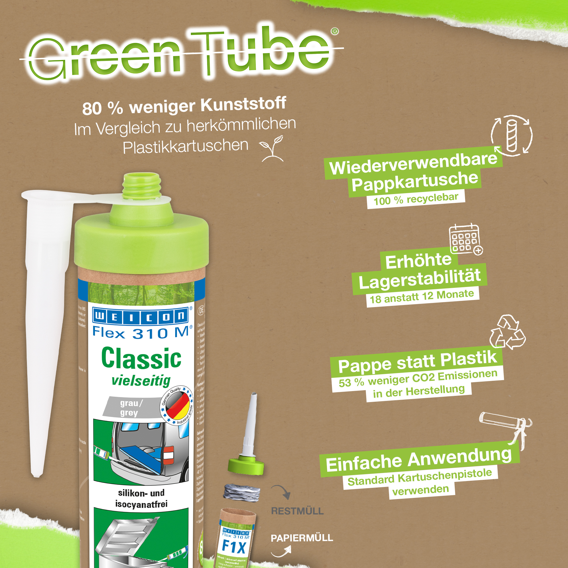 WEICON Flex 310 M Klasik Yapıştırıcı ve Sızdırmazlık Malzemesi güçlüdür, boyanabilirdir (ıslakta ıslak), taşlanabilir, harika bir yıpranma kararlılığına ve UV ışınlarına iyi dirence sahiptir. Tatlı suya ve tuzlu suya dirençlidir, silikon, izosiyanat, halojen ve solvent içermez. Ürün ISEGA onaylıdır ve gıda teknolojisinde yapıştırıcı olarak kullanılabilmektedir. Flex 310 M Klasik polimer temelde klasik elastik yapıştırıcıdır ve metaller, pek çok plastikler, seramik, ahşap, cam ve taş için uygundur. WEICON Flex 310 M Klasik metal yapımında, tank ve aparat mühendisliğinde, taşıt, araç ve konteyner yapımında, havalandırma ve klima sistemlerinde, elektrik endüstrisinde, yat ve tekne yapımında ve silikon içeren ürünlerin uygun olmadığı tüm uygulamalarda kullanılır.
