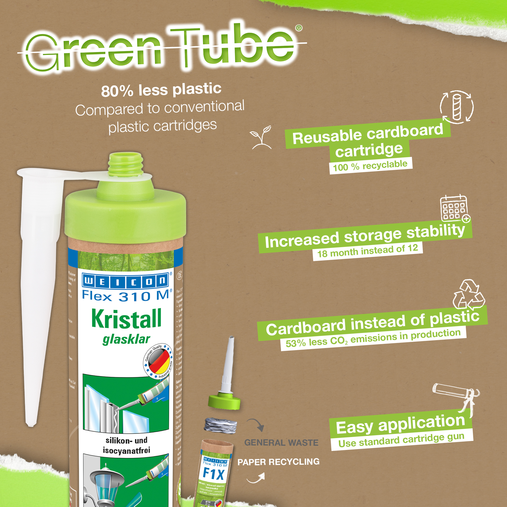 WEICON Flex 310 M Kristal Yapıştırıcı ve Sızdırmazlık maddesi şeffaftır, güçlüdür, boyanabilir (ıslakta ıslak), kumlanabilir ve harika bir yıpranma kararlılığı ve UV ışınlarına direnci vardır. Tatlı suya ve tuzlu suya dirençlidir, silikon, izosiyanat, halojen ve solvent içermez. WEICON Flex 310 M Kristal ISEGA onaylıdır ve gıda teknolojisinde yapıştırıcı olarak kullanılabilmektedir. WEICON Flex 310 M Kristal MS polimer temelde elastik yapıştırıcıdır ve cam, PC**, PMMA** ve akrilik cam** (**= yalnızca gerilimsiz yapışma), metaller, pek çok plastikler, seramikler, ahşap ve taş için uygundur. Flex 310 M Kristal plastik işlemede, metal yapımında, tank ve aparat mühendisliğinde, havalandırma ve klima sistemleri, elektrik ve aydınlatma sektöründe, sergi stand yapımında ve mağaza düzenleme parçalarında ve silikon ve silikon içeren ürünlerin uygun olmadığı tüm uygulamalarda kullanılır. * = Yalnızca gerilimsiz yapışma
