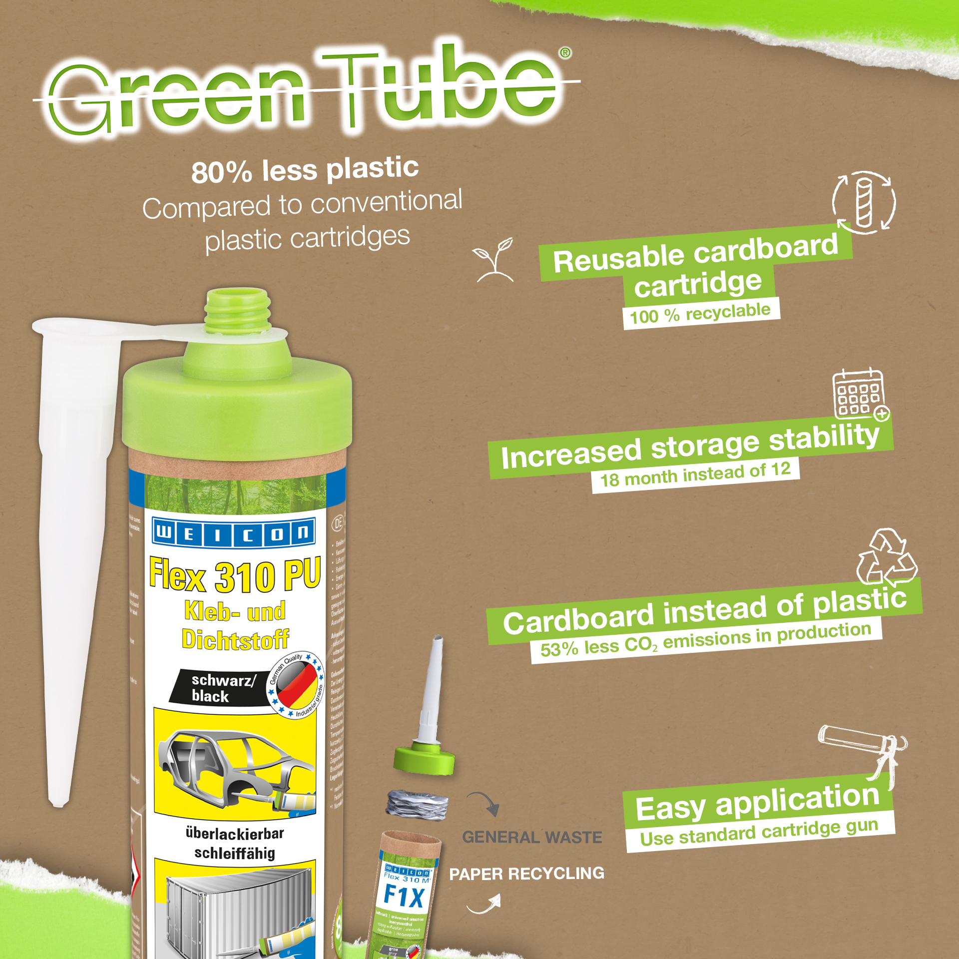 WEICON Flex 310 PU yapıştırıcı ve sızdırmazlık malzemesi kalıcı olarak elastik, güçlü, boyanabilir, hava şartlarına, UV ışınlarına, tatlı suya ve tuzlu suya dayanıklıdır. Silikon içermez. Flex 310 PU metaller, plastikler, seramikler, ahşap, cam ve taş gibi pek çok malzemenin yapışması ve sızdırmazlığı için poliüretan temelde (PUR) elastik yapıştırıcı ve sızdırmazlık malzemesidir. WEICON Flex 310 PU tank ve aparat mühendisliğinde, taşıt, konteyner ve araç yapımında, havalandırma ve klima sistemlerinde, enerji ve elektrik endüstrisinde ve silikon ve silikon içeren ürünlerin uygun olmadığı tüm uygulamalarda kullanılır.