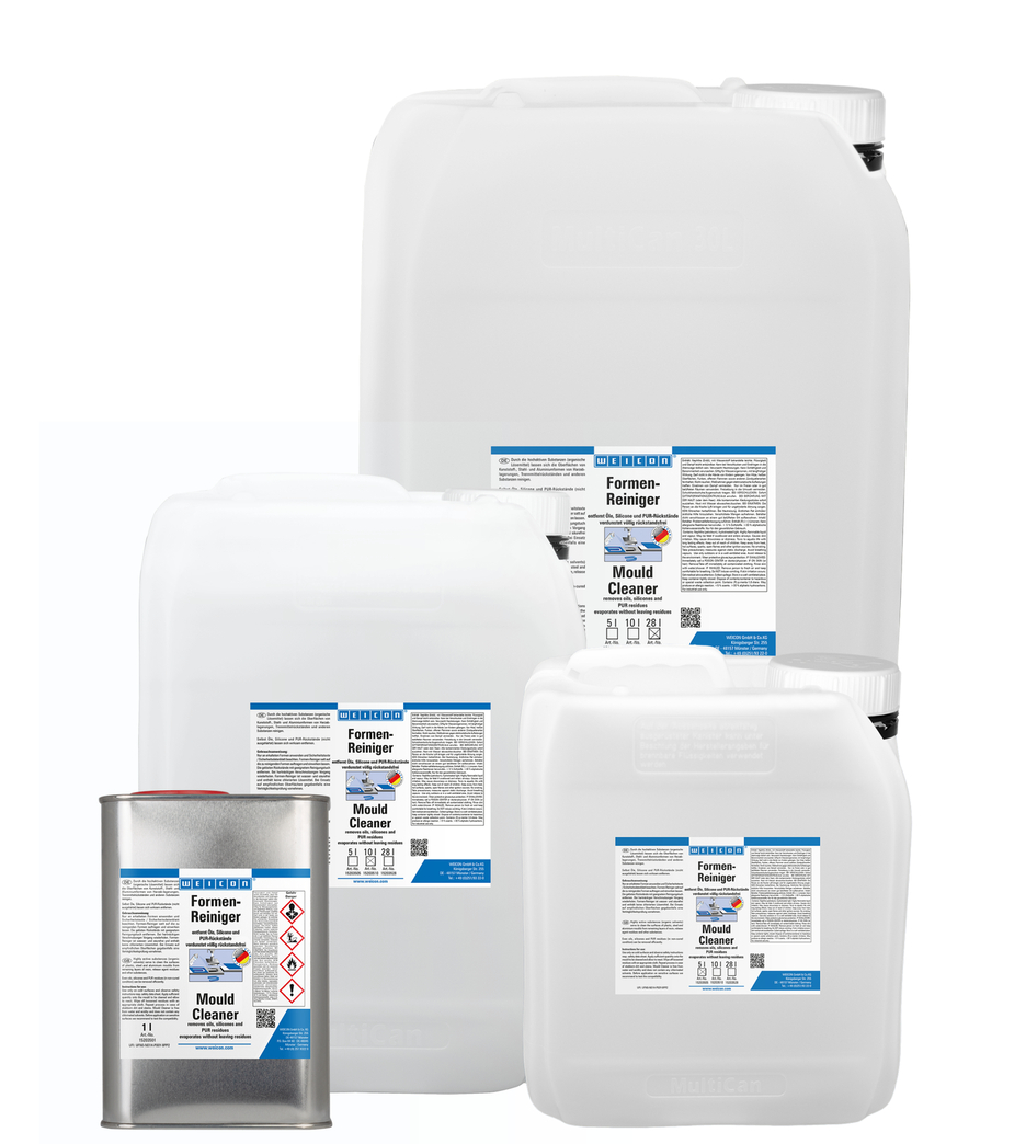 WEICON Kalıp Temizleyici yüksek aktif organik solvent bazlı özel temizleyicidir. Balmumu, silikon, yağ, sertleşmemiş PUR artıklar ve plastik, çelik veya alüminyum kalıplarından Diğerleri artıkları etkili bir şekilde temizler.