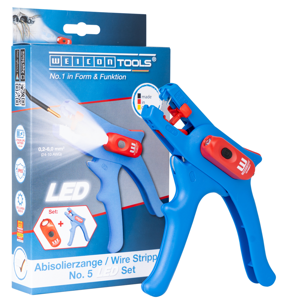 Kablo Sıyırıcı No. 5: tüm yaygın çok telli ve tek damarlı iletkenler için otomatik kablo soyucu (0,2 - 6,0 mm²) | 2 mm Ø'ye kadar entegre, kolay erişilebilir yan keski | uzunluk durdurucusu (5 - 12 mm) sayesinde hassas çalışma | pense kilitleme mekanizması sayesinde yerden tasarruf | LED Lamba: entegre LED aydınlatma, aydınlık bir çalışma alanı sağlayarak iki elle güvenli çalışma imkanı sunar | 180 mAh'lik güçlü ve şarj edilebilir lityum pil | 40 dakikalık şarj süresinden sonra 2 saat ışık süresi (seviye 2'de) | 250 lümene kadar üç parlaklık seviyesi, ışık rengi: 6500 K | toz geçirmez, sıçramaya dayanıklı ve darbeye dayanıklı polikarbonat gövde, IP65 koruma sınıfına göre test edilmiştir | birçok WEICON TOOLS kablo sıyırıcıyla uyumludur.