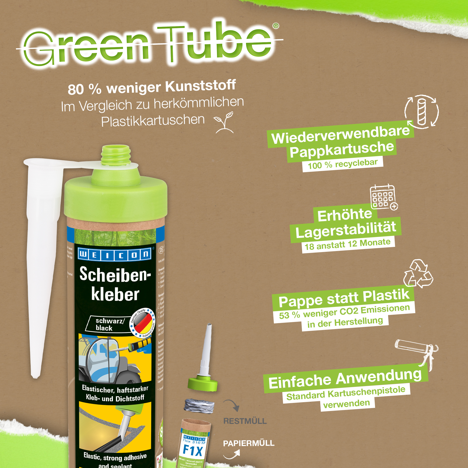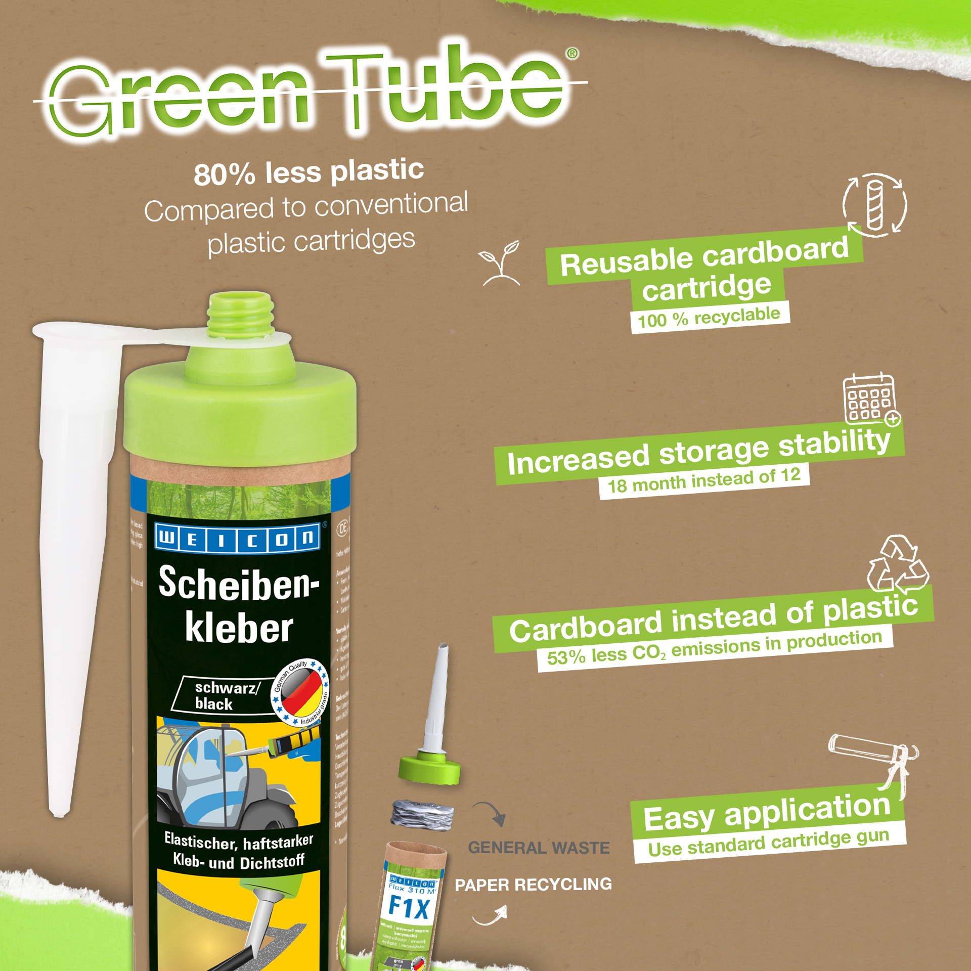 WEICON Pencere Yapıştırıcısı, cam ve camların montajı için özel olarak geliştirilmiş, MS polimer esaslı, elastik, 1 bileşenli bir yapıştırıcı ve sızdırmazlık malzemesidir. Örneğin, yapıştırıcı endüstriyel kamyonlarda, tarım ve inşaat makinelerinde ön, arka ve yan camları takmak için kullanılabilir. Ayrıca bahçe ve peyzaj düzenlemelerinde mobilya imalatı veya montaj için de uygundur. Cam yapıştırıcısı birçok yüzeyde yüksek yapışma gücüne sahiptir ve nem ile kürlenir. Yapıştırıcı, mükemmel yaşlanma direncine ve iyi bir UV stabilitesine sahiptir. Derz dolgusu olarak kullanılabilir ve kokusuzdur, silikon, izosiyanat, halojen ve solvent içermez.