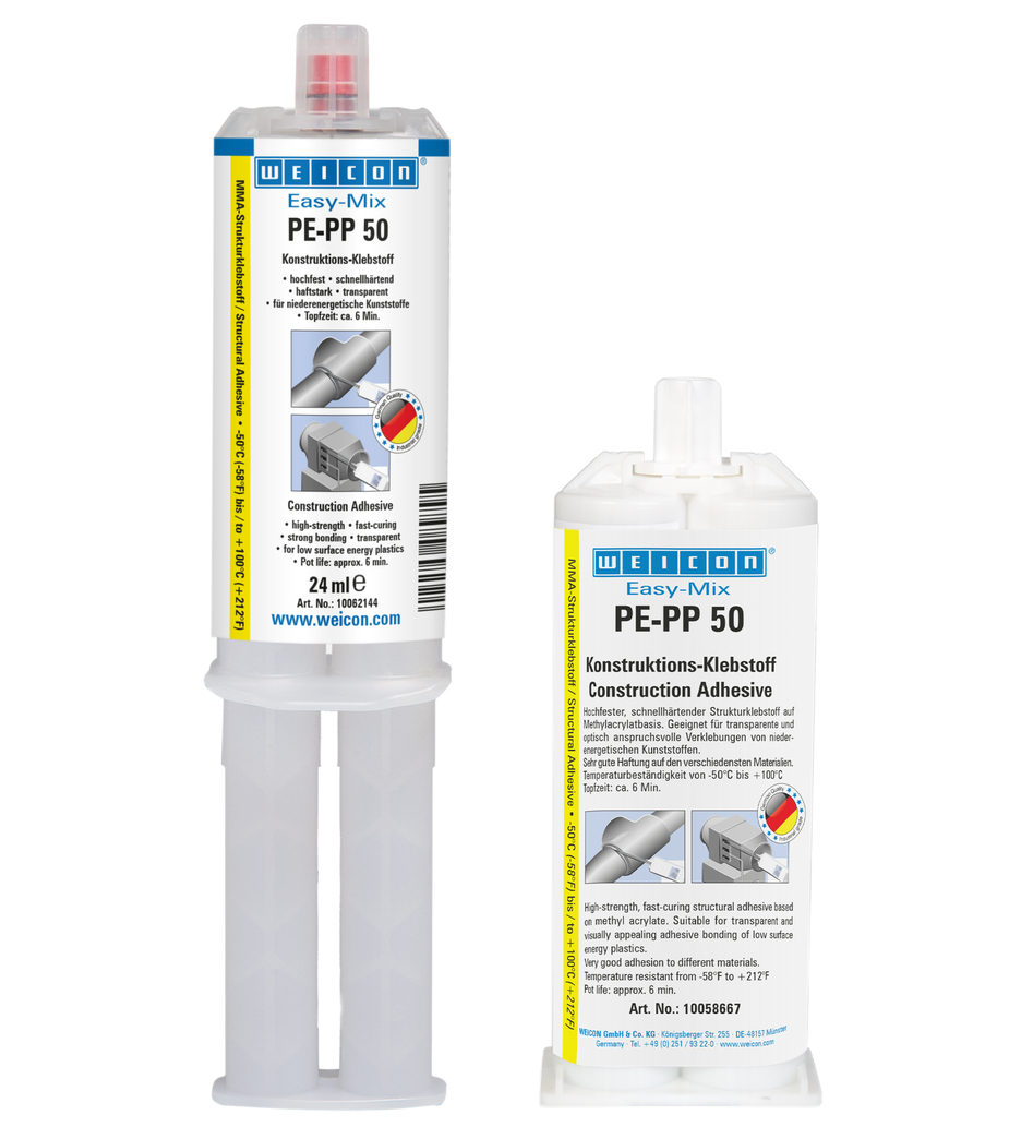 WEICON Easy-Mix PE-PP 50 metil akrilat bazlı 2 bileşenli bir yapısal yapıştırıcıdır. Şeffaf kürlenmesi nedeniyle, özellikle düşük enerjili plastiklerin optik açıdan hoş ve yüksek mukavemetli yapıştırılması için uygundur (Örneğin PE, PP ve TPE). Özel formülü sayesinde sıfır boşluklu derzler ve 0,2 mm'den daha küçük yapıştırma boşluklarına sahip yüzeylerin yapıştırılması için idealdir. Yapısal yapıştırıcı, hızlı bir mukavemet gelişimine ve yüksek bir nihai mukavemete sahiptir. Darbeye, tahribata, kimyasallara dayanıklı ve hafiftir. PE-PP 50'nin 6 dakikalık kısa bir kap ömrü vardır. 1:1 oranında işlenir ve yapıştırıcının içerisinde primer bulunduğundan, yapıştırılacak parçaların ön işleme tabi tutulmasına gerek kalmaz. 50 ml’lik ambalajlardaki Easy-Mix ürünlerinin işlenebilmesi için Easy-Mix D 50 dozaj tabancasına ihtiyaç duyulmaktadır.