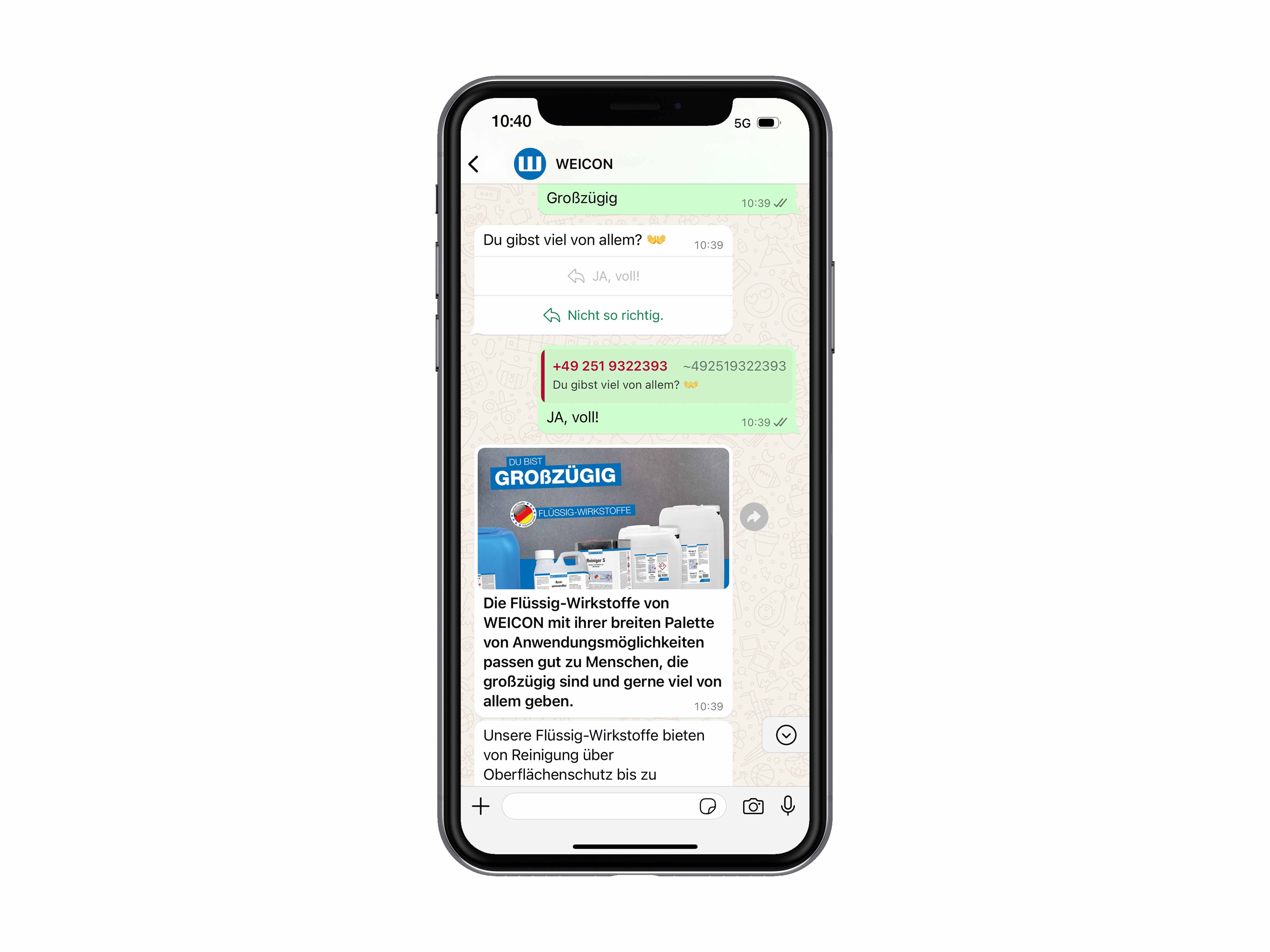 Genel olarak ürünlerimizle ilgileniyor musunuz? Ancak yağlayıcı mı, gres mi, tek komponentli mi, yoksa çift komponentli yapıştırıcı mı kullanacağınızı bilmiyor musunuz veya hala doğru el aletini bulamadınız mı? O zaman WhatsApp hizmetimizin yardımıyla daha fazlasını öğrenin veya "Hangi WEICON ürünüyüm?" testimize katılın.