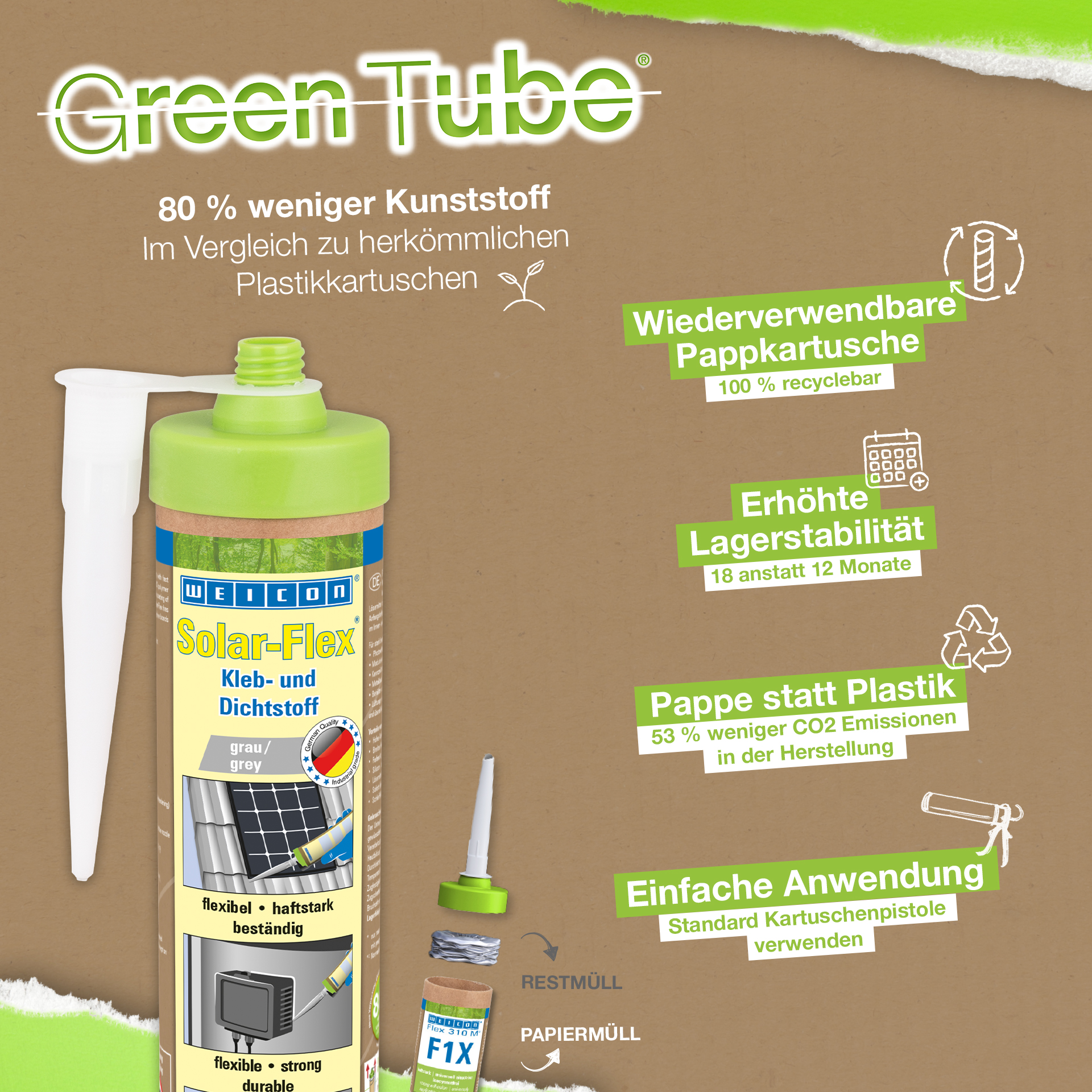 WEICON Solar-Flex® güçlü, anti korozif, boyanabilir (ıslakta ıslak), hava koşullarına dayanıklı ve UV ışınlarına dayanıklıdır. Silikon, izosiyanat, halojen ve solvent içermez. WEICON Solar-Flex® özellikle güneş enerjisi endüstrisi için gekiştirilmiş MS polimer temelde elastik yapıştırıcıdır. Hem çok yüksek ilk yapışma gücü hem de yapıştırıcı gücünün hızlı gelişimi dikey yüzeylerde bile bağlantıların yapılmasına imkan sağlar. Güneş ve fotovoltaik güç sistemlerinin montajında klasik sabitleme yöntemlerinin yerine geçer.