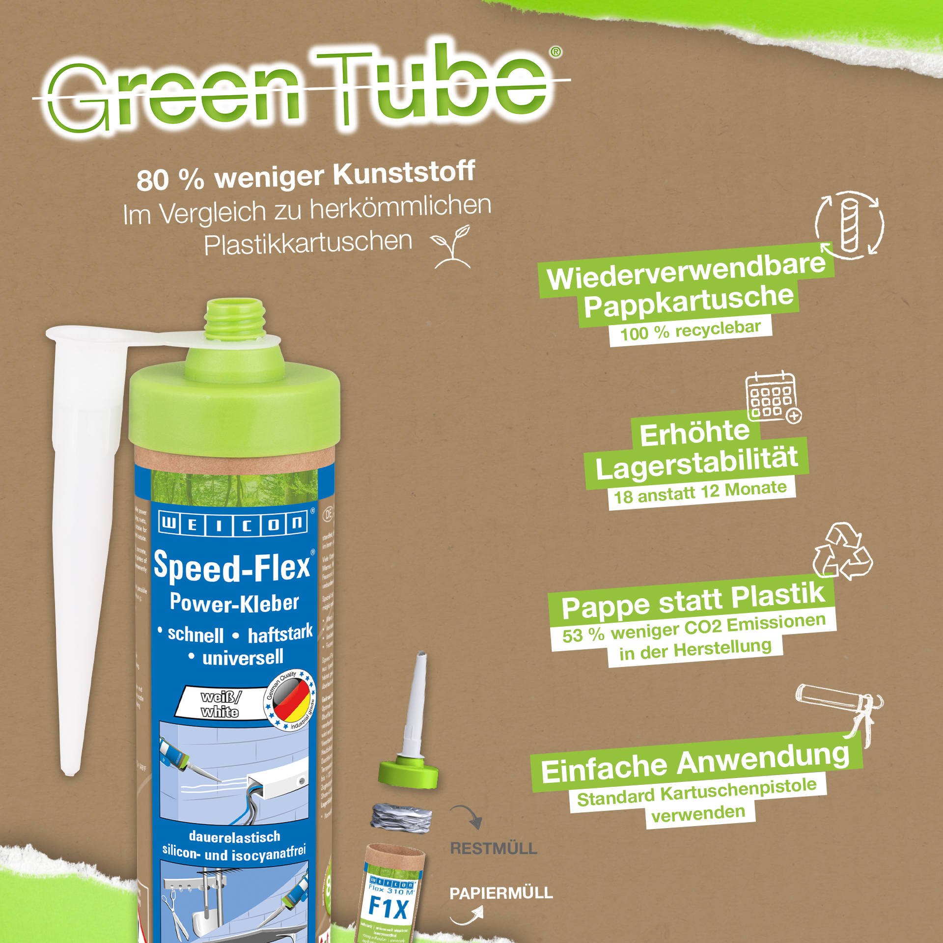 Speed-Flex yapışkan, macun kıvamında ve stabildir. "Islak üstüne ıslak" şekilde boyanabilir. Eskimeye karşı dirençli, hava koşullarına ve UV ışınlarına dayanıklıdır. Silikon, izosiyanat, halojen ve solvent içermez. Speed-Flex ISEGA sertifikalıdır ve gıda teknolojisinde yapıştırıcı olarak kullanılabilir. Yapıştırıcı ve dolgu macunu MS polimer bazlıdır ve son derece güçlü bir ilk yapışmaya sahiptir ve metallerin, birçok plastiğin, seramiğin, ahşabın, camın ve taşın yapıştırılması için uygundur. Speed-Flex, vidalar, dübeller, perçinler vb. gibi geleneksel sabitleyicilerin yerini alır. Çok yüksek ilk yapışma özelliği sayesinde, iç ve dış mekanlarda dikey yüzeylerde bile yapıştırma mümkündür. Alçıpan ve iç yapıda, metal konstrüksiyonda, tank ve aparat yapımında, havalandırma ve iklimlendirme teknolojisinde, fuar ve mağaza donanımında, silikonların veya silikon içeren ürünlerin uygun olmadığı her yerde kullanılabilir.
