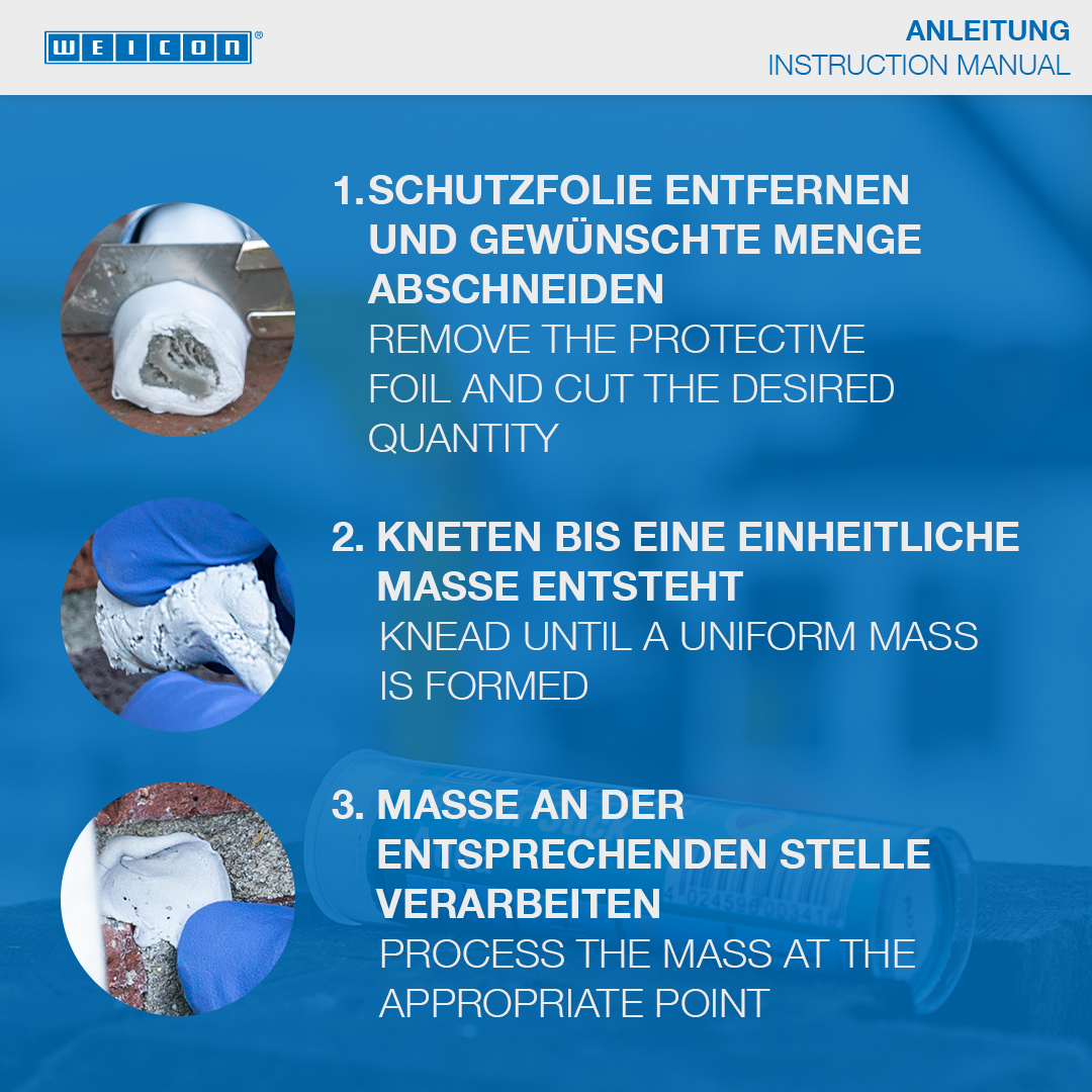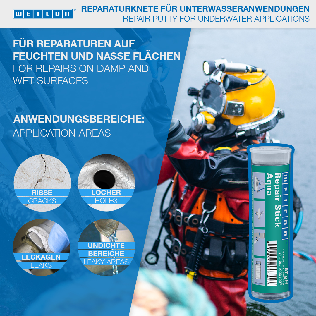 Nemli ve ıslak yüzeylerde hızlı onarımlar ve su altı uygulamaları için idealdir. Benzin ve su tankları, radyatörler, elektrik şalterleri, sıhhi tesisler ve yüzme havuzlarındaki çatlak, delik, sızıntı ve kaçakların onarımı ve sızdırmazlığı için. WEICON Tamir Çubuğu Aqua, sıhhi tesisat ve ısıtma tesisatlarında, elektrik sektöründe, denizcilik sektöründe ve endüstrinin diğer birçok alanında kullanılabilir.