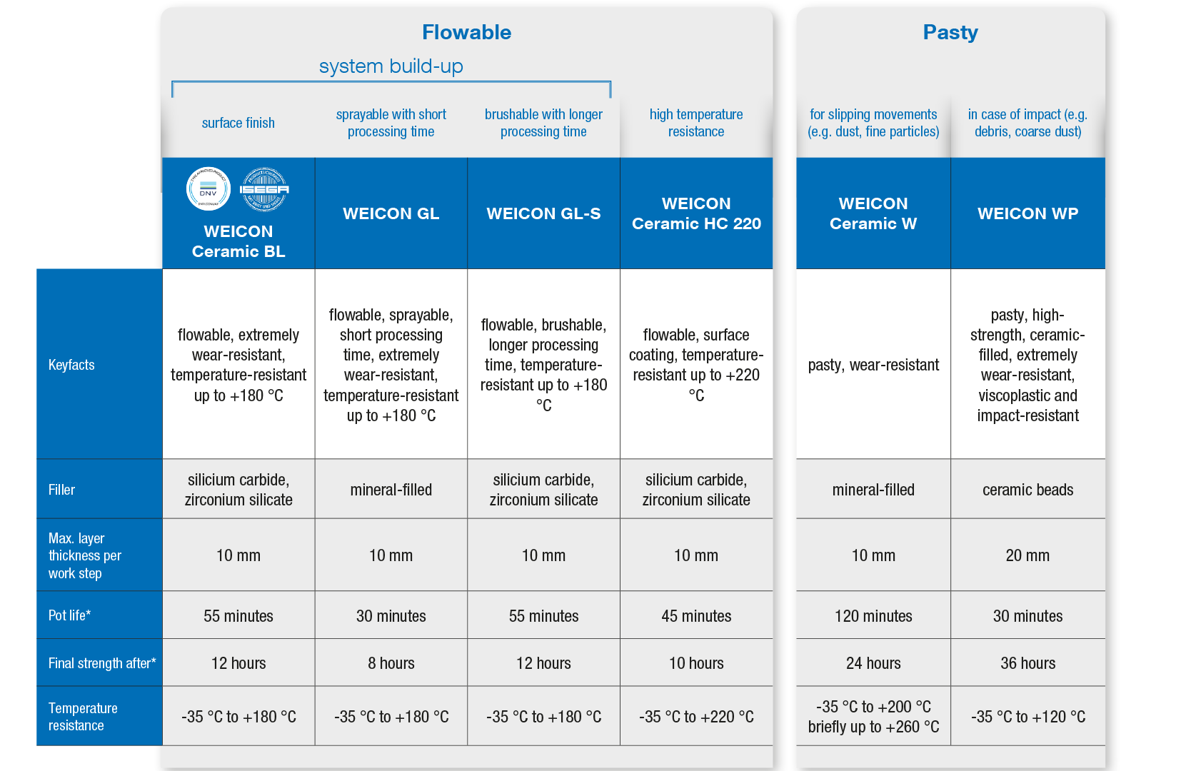WEICON, derzleme, astarlama ve boşluk doldurma için kullanılabilecek geniş bir ürün yelpazesi sunmaktadır. Prototiplerin veya tutma tertibatlarının imalatında da kullanılırlar. Özel ürünler aynı zamanda konveyör sistemlerini, kızakları veya kılavuz rayları onarmak için idealdir. Epoksi reçineler çelik konstrüksiyonda, ray yapımında, vinç sistemlerinde ve köprü onarımında kullanılırlar. Bu onarım sistemlerinin avantajları yüksek akışkanlık, yüksek yapışma ve çok iyi basınç direncidir. Ayrıca uzun süreli korozyon koruması sağlarlar.