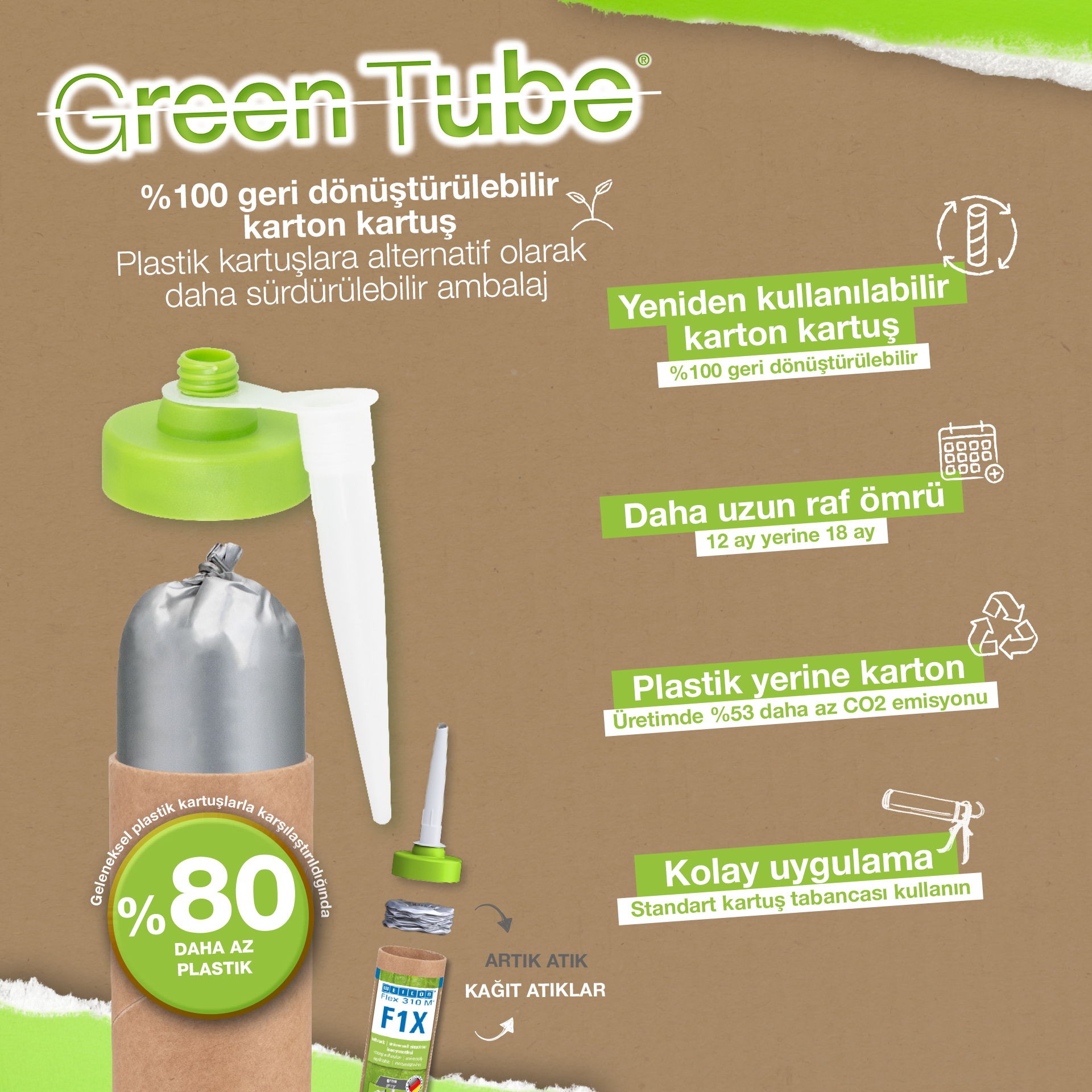 Green Tube kartuşunun üretiminde geleneksel kartuşlara göre %80 daha az plastik kullanılır. Kartuş gövdesi %100 sertleştirilmiş kartondan yapılmıştır. Üretim, PE kartuş üretimine göre %53 daha az CO2 emisyonuna neden olur. Bu iklim ve çevre için açık bir avantajdır.
