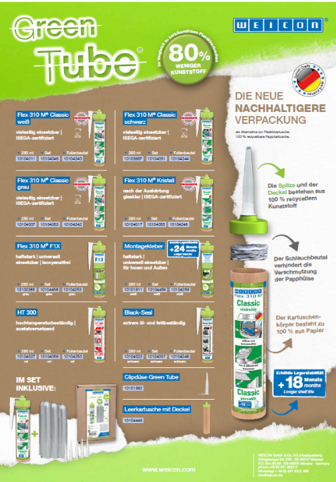 The production of the Green Tube cartridge uses 80 % less plastic than conventional cartridges. The cartridge casing is made from 100 % hardened cardboard. Production generates 53 % less CO₂ emissions than the manufacturing of a PE cartridge – a clear advantage for the climate and the environment.