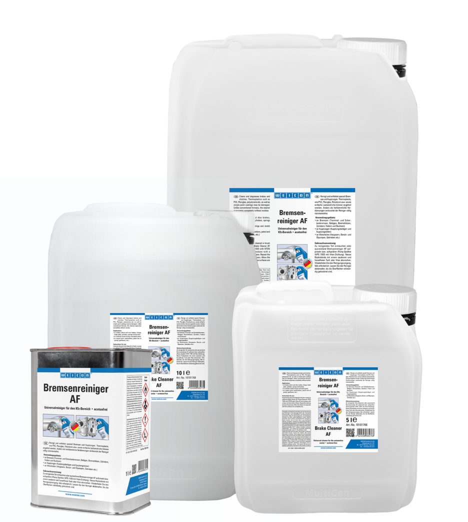 WEICON Fren ve Balata Temizleyici AF, otomotiv sektörü için aseton içermeyen üniversal bir temizleyicidir. Sıvı madde, yüzeyleri temizler, yağdan arındırır ve kalıntı bırakmadan tamamen buharlaşır. Fren ve Balata Temizleyici AF metalleri, camları, kauçuk malzemeleri, toz boya kaplı yüzeyleri ve birçok plastiği hızlı ve zahmetsizce yağdan arındırır ve temizler. Yağ ve gres kalıntılarını güvenilir bir şekilde giderir. Frenlerde (kampana, disk frenler, balatalar, fren balataları, silindirler, yaylar ve burçlar), debriyajlarda (debriyaj balataları ve parçaları) veya motor parçalarında (karbüratörler, benzin ve yağ pompaları, dişli kutuları, vb.) kullanılır. Bununla birlikte, plastik profillerin, contaların veya boyalı yüzeylerin temizlenmesi için de uygundur ve endüstri ve ticaretin birçok alanında kullanılabilir.