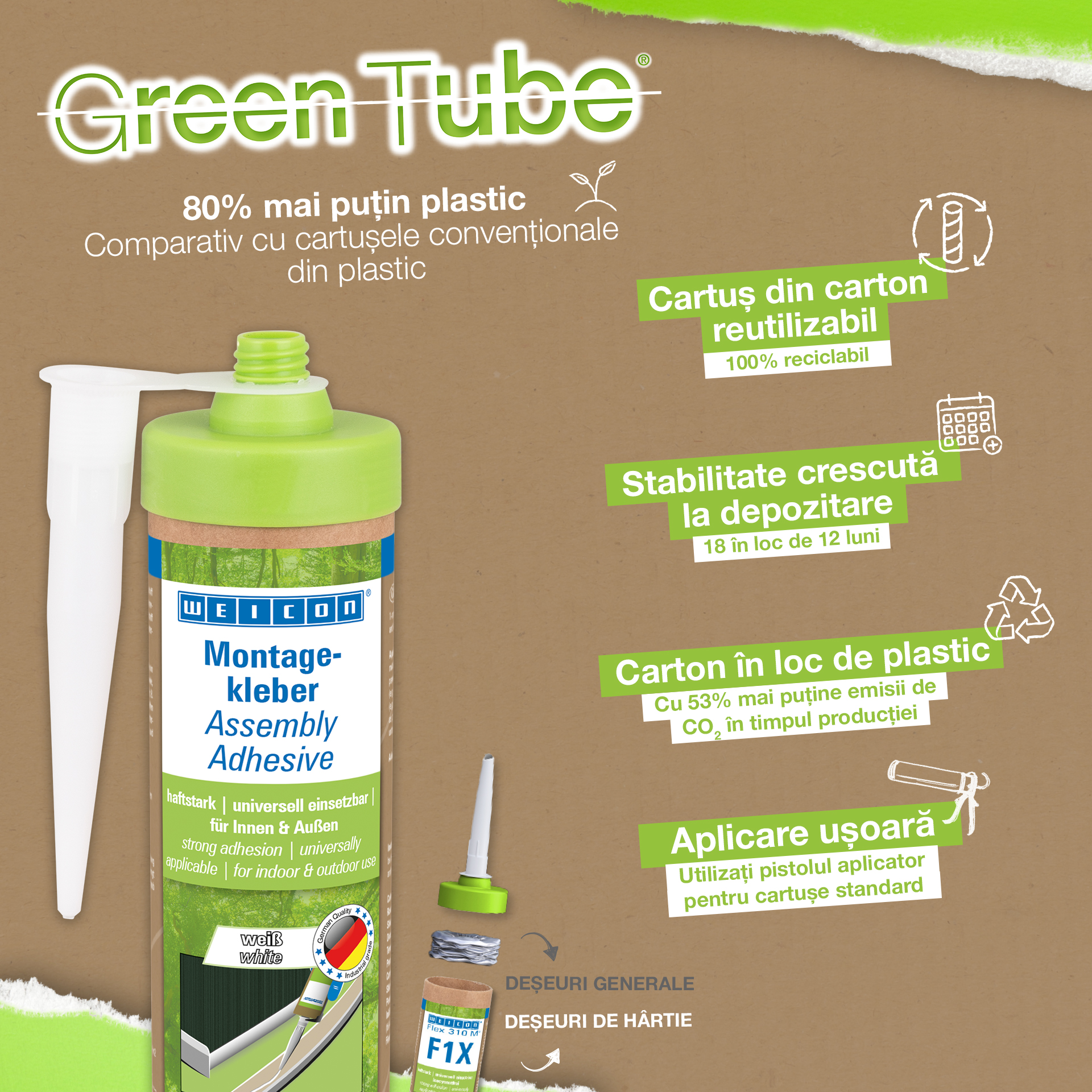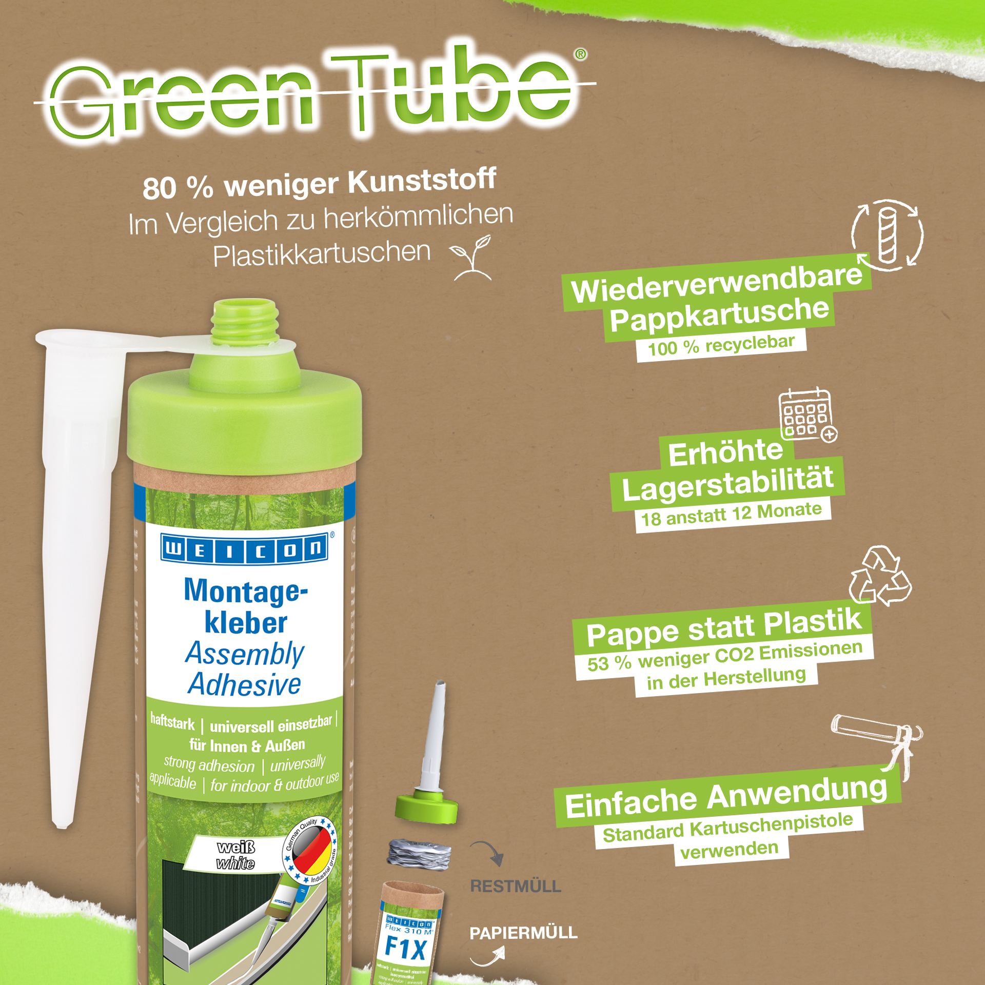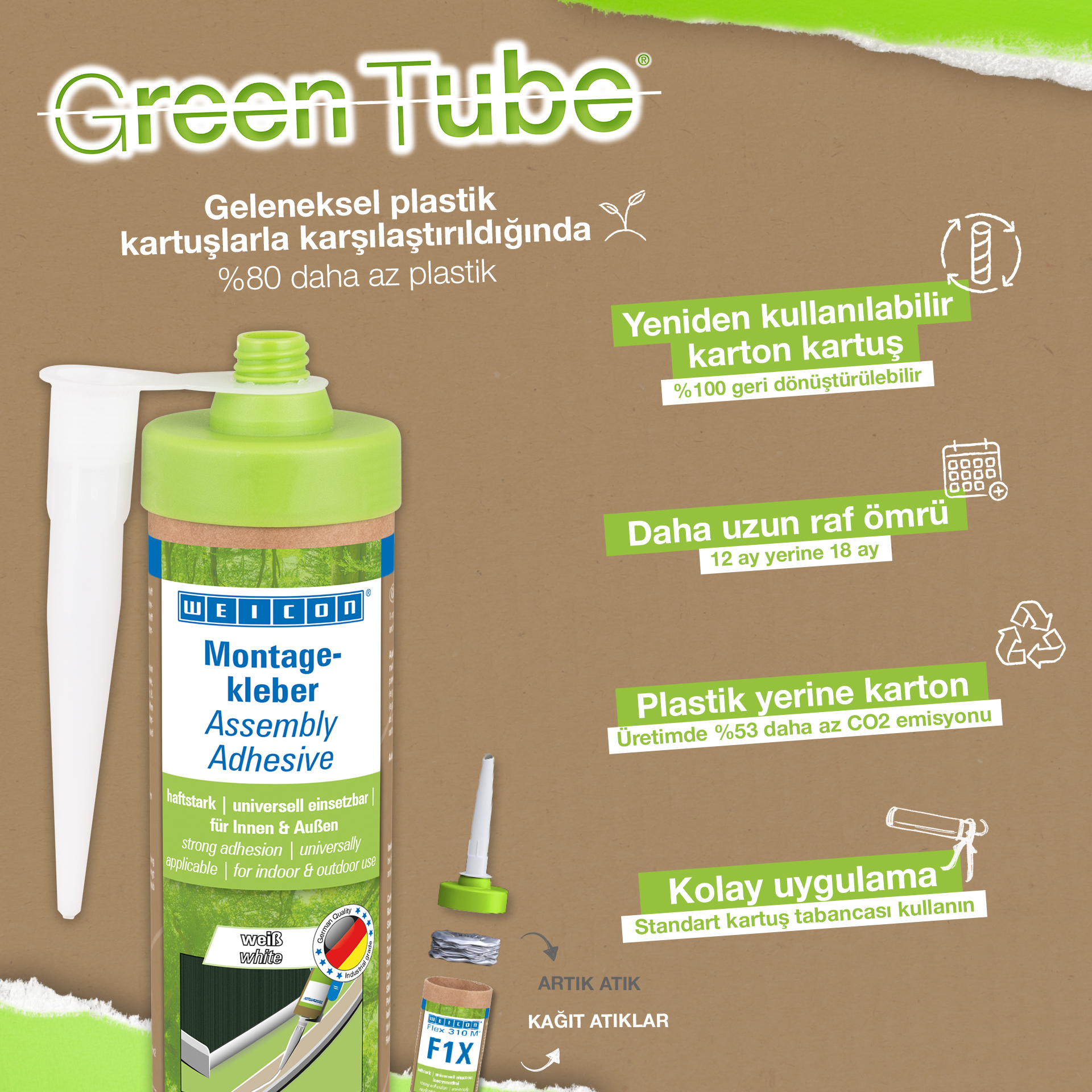 WEICON Montaj Yapıştırıcısı, montaj, onarım ve rötuş işleri için güçlü bir dispersiyon akrilik yapıştırıcıdır. Yapıştırıcı, yüksek bir ilk yapışma ve nihai mukavemete sahiptir olup hızlı bir şekilde kürlenir. Kuruduktan sonra, montaj yapıştırıcısı zımparalanabilir ve sıvanabilir. Üzeri boya ve verniklerle boyanabilir. Yapıştırıcı -20 °C ila +80 °C aralığında sıcaklığa dayanıklı olup hem iç hem de dış mekan uygulamaları için uygundur. Beyaz esnek yapıştırıcı düşük emisyonludur ve solvent içermez. Montaj yapıştırıcısı evrensel olarak uygulanabilir ve çok çeşitli uygulamalar için kullanılabilir. Örneğin ahşap malzemelerin (süpürgelikler, dekoratif şeritler, paneller veya sunta gibi), PVC, polistiren, polistiren köpük levhalar, PU sert köpük (örn. yalıtım levhaları ve kablo kanalları), mineral malzemeler (örn. fayanslar) ve metallerin sıva, beton, fiber çimento, alçıpan ve işlenmemiş ahşap gibi emici yüzeylere yüzey yapıştırılması için idealdir. Çevre dostu ambalaj – aynı güçlü performans! Green Tube, sürdürülebilir ambalaj: uç ve kapak %100 geri dönüştürülmüş plastikten, kartuş gövdesi ise tamamen kartondan üretilmiştir. Bu sayede geleneksel kartuşlara kıyasla daha düşük CO₂ emisyonu ve daha az plastik kullanımı sağlanmıştır. Tüm bunları ürünün performansından ödün vermeden yapar!