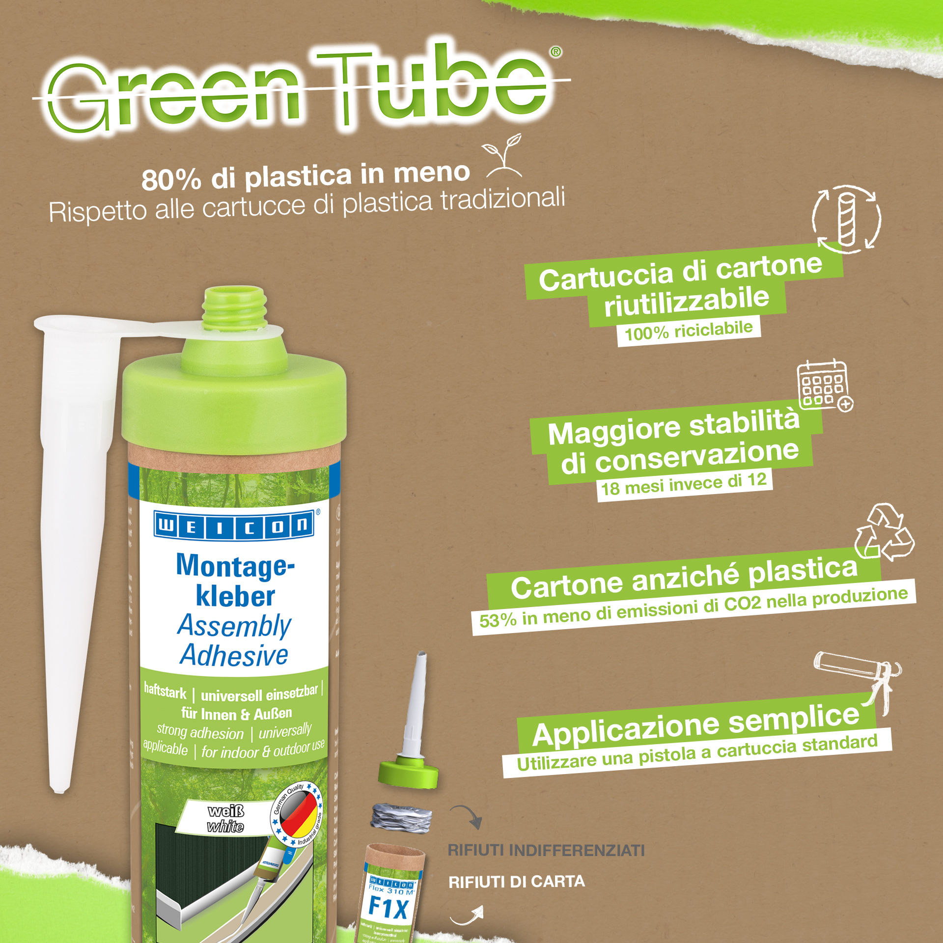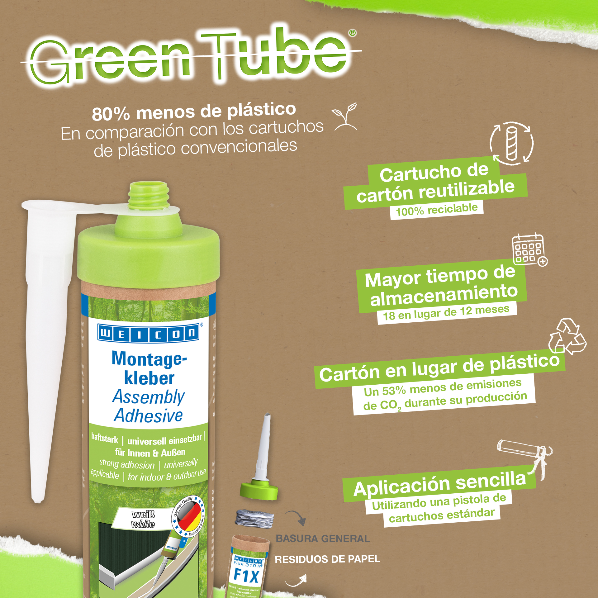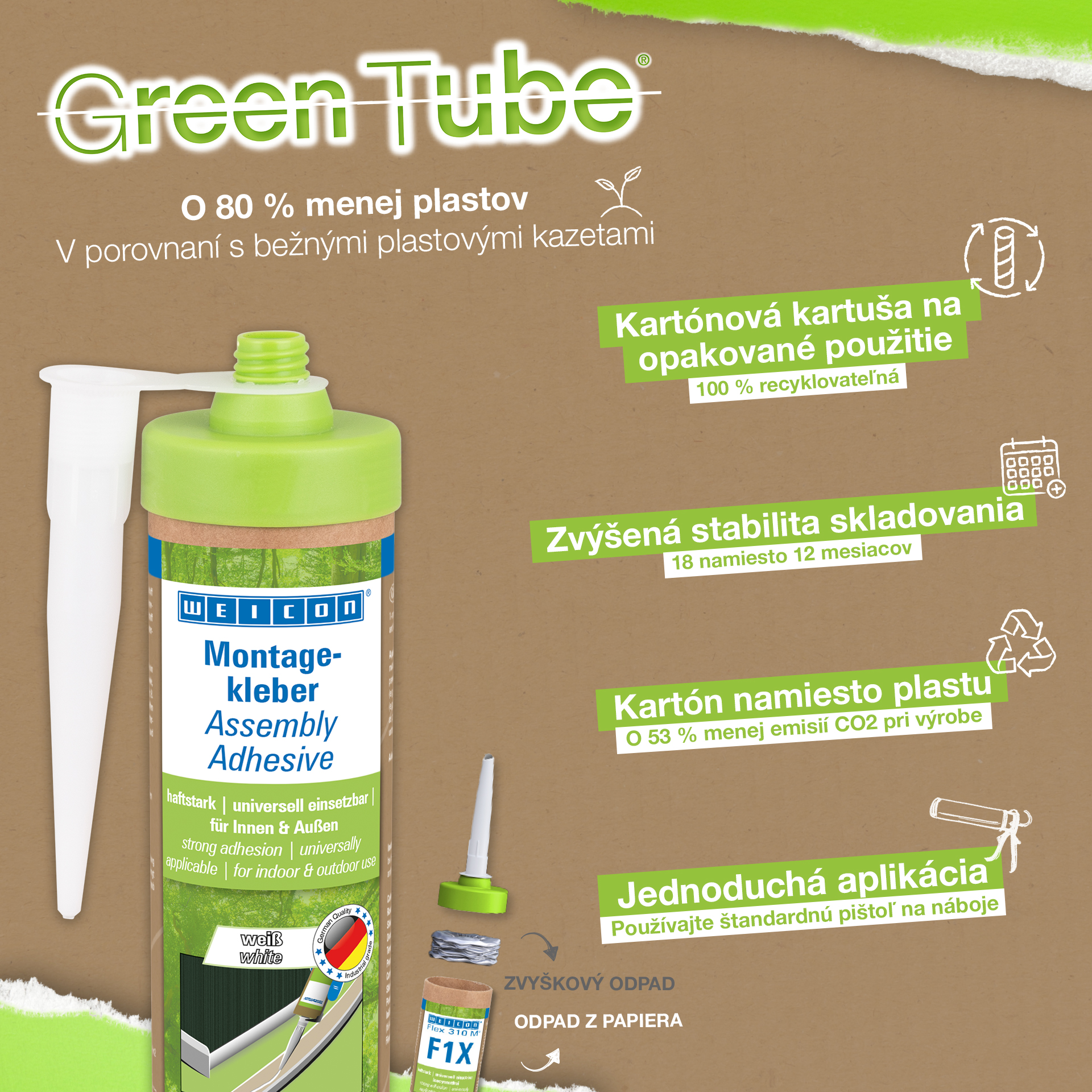 WEICON Montaj Yapıştırıcısı, montaj, onarım ve rötuş işleri için güçlü bir dispersiyon akrilik yapıştırıcıdır. Yapıştırıcı, yüksek bir ilk yapışma ve nihai mukavemete sahiptir olup hızlı bir şekilde kürlenir. Kuruduktan sonra, montaj yapıştırıcısı zımparalanabilir ve sıvanabilir. Üzeri boya ve verniklerle boyanabilir. Yapıştırıcı -20 °C ila +80 °C aralığında sıcaklığa dayanıklı olup hem iç hem de dış mekan uygulamaları için uygundur. Beyaz esnek yapıştırıcı düşük emisyonludur ve solvent içermez. Montaj yapıştırıcısı evrensel olarak uygulanabilir ve çok çeşitli uygulamalar için kullanılabilir. Örneğin ahşap malzemelerin (süpürgelikler, dekoratif şeritler, paneller veya sunta gibi), PVC, polistiren, polistiren köpük levhalar, PU sert köpük (örn. yalıtım levhaları ve kablo kanalları), mineral malzemeler (örn. fayanslar) ve metallerin sıva, beton, fiber çimento, alçıpan ve işlenmemiş ahşap gibi emici yüzeylere yüzey yapıştırılması için idealdir. Çevre dostu ambalaj – aynı güçlü performans! Green Tube, sürdürülebilir ambalaj: uç ve kapak %100 geri dönüştürülmüş plastikten, kartuş gövdesi ise tamamen kartondan üretilmiştir. Bu sayede geleneksel kartuşlara kıyasla daha düşük CO₂ emisyonu ve daha az plastik kullanımı sağlanmıştır. Tüm bunları ürünün performansından ödün vermeden yapar!