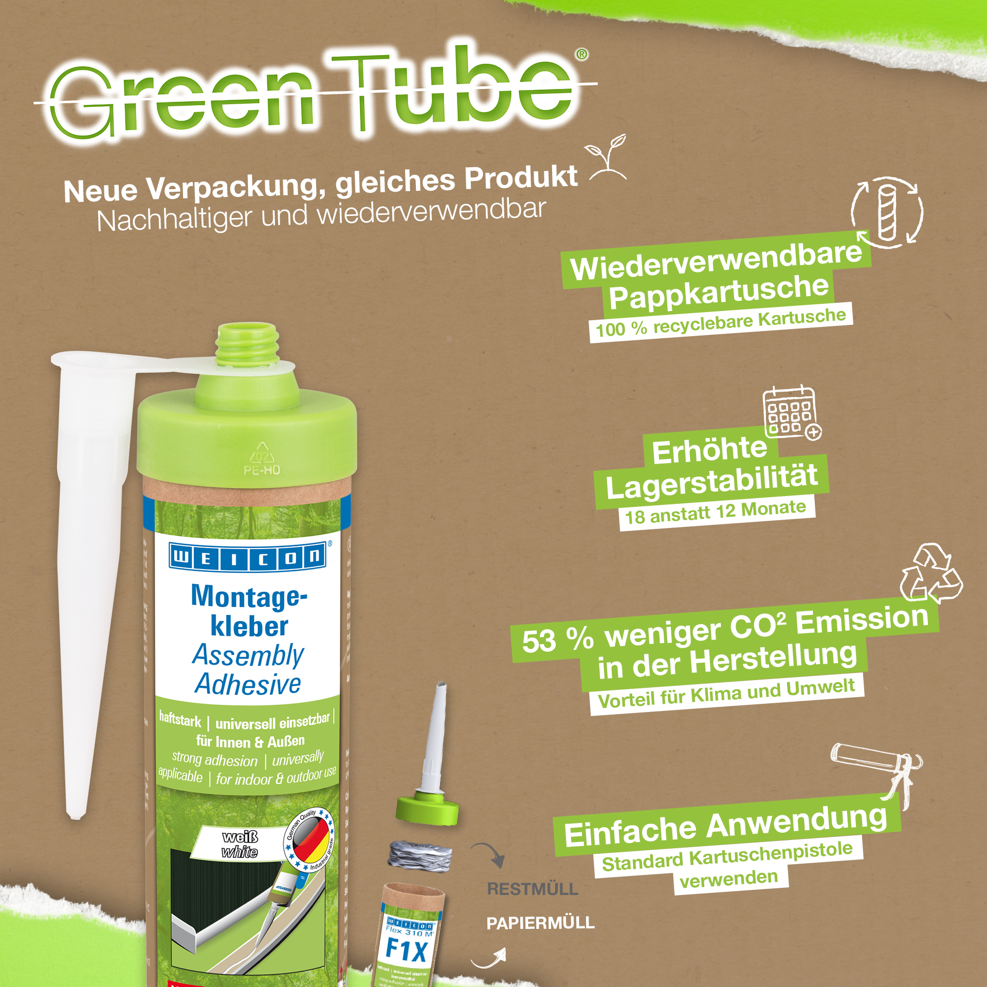 WEICON Montaj Yapıştırıcısı, montaj, onarım ve rötuş işleri için güçlü bir dispersiyon akrilik yapıştırıcıdır. Yapıştırıcı, yüksek bir ilk yapışma ve nihai mukavemete sahiptir olup hızlı bir şekilde kürlenir. Kuruduktan sonra, montaj yapıştırıcısı zımparalanabilir ve sıvanabilir. Üzeri boya ve verniklerle boyanabilir. Yapıştırıcı -20 °C ila +80 °C aralığında sıcaklığa dayanıklı olup hem iç hem de dış mekan uygulamaları için uygundur. Beyaz esnek yapıştırıcı düşük emisyonludur ve solvent içermez. Montaj yapıştırıcısı evrensel olarak uygulanabilir ve çok çeşitli uygulamalar için kullanılabilir. Örneğin ahşap malzemelerin (süpürgelikler, dekoratif şeritler, paneller veya sunta gibi), PVC, polistiren, polistiren köpük levhalar, PU sert köpük (örn. yalıtım levhaları ve kablo kanalları), mineral malzemeler (örn. fayanslar) ve metallerin sıva, beton, fiber çimento, alçıpan ve işlenmemiş ahşap gibi emici yüzeylere yüzey yapıştırılması için idealdir. Çevre dostu ambalaj – aynı güçlü performans! Green Tube, sürdürülebilir ambalaj: uç ve kapak %100 geri dönüştürülmüş plastikten, kartuş gövdesi ise tamamen kartondan üretilmiştir. Bu sayede geleneksel kartuşlara kıyasla daha düşük CO₂ emisyonu ve daha az plastik kullanımı sağlanmıştır. Tüm bunları ürünün performansından ödün vermeden yapar!