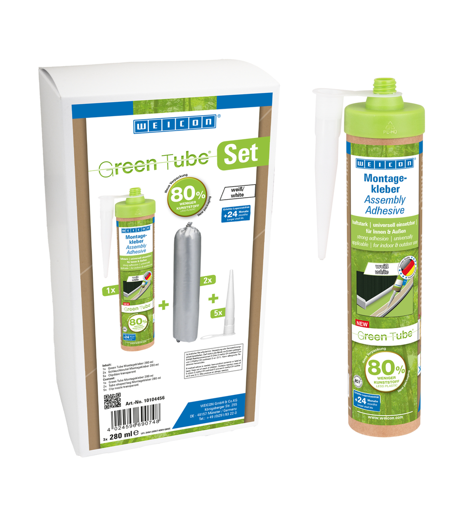 WEICON Montaj Yapıştırıcısı, montaj, onarım ve rötuş işleri için güçlü bir dispersiyon akrilik yapıştırıcıdır. Yapıştırıcı, yüksek bir ilk yapışma ve nihai mukavemete sahiptir olup hızlı bir şekilde kürlenir. Kuruduktan sonra, montaj yapıştırıcısı zımparalanabilir ve sıvanabilir. Üzeri boya ve verniklerle boyanabilir. Yapıştırıcı -20 °C ila +80 °C aralığında sıcaklığa dayanıklı olup hem iç hem de dış mekan uygulamaları için uygundur. Beyaz esnek yapıştırıcı düşük emisyonludur ve solvent içermez. Montaj yapıştırıcısı evrensel olarak uygulanabilir ve çok çeşitli uygulamalar için kullanılabilir. Örneğin ahşap malzemelerin (süpürgelikler, dekoratif şeritler, paneller veya sunta gibi), PVC, polistiren, polistiren köpük levhalar, PU sert köpük (örn. yalıtım levhaları ve kablo kanalları), mineral malzemeler (örn. fayanslar) ve metallerin sıva, beton, fiber çimento, alçıpan ve işlenmemiş ahşap gibi emici yüzeylere yüzey yapıştırılması için idealdir. Çevre dostu ambalaj – aynı güçlü performans! Green Tube, sürdürülebilir ambalaj: uç ve kapak %100 geri dönüştürülmüş plastikten, kartuş gövdesi ise tamamen kartondan üretilmiştir. Bu sayede geleneksel kartuşlara kıyasla daha düşük CO₂ emisyonu ve daha az plastik kullanımı sağlanmıştır. Tüm bunları ürünün performansından ödün vermeden yapar!