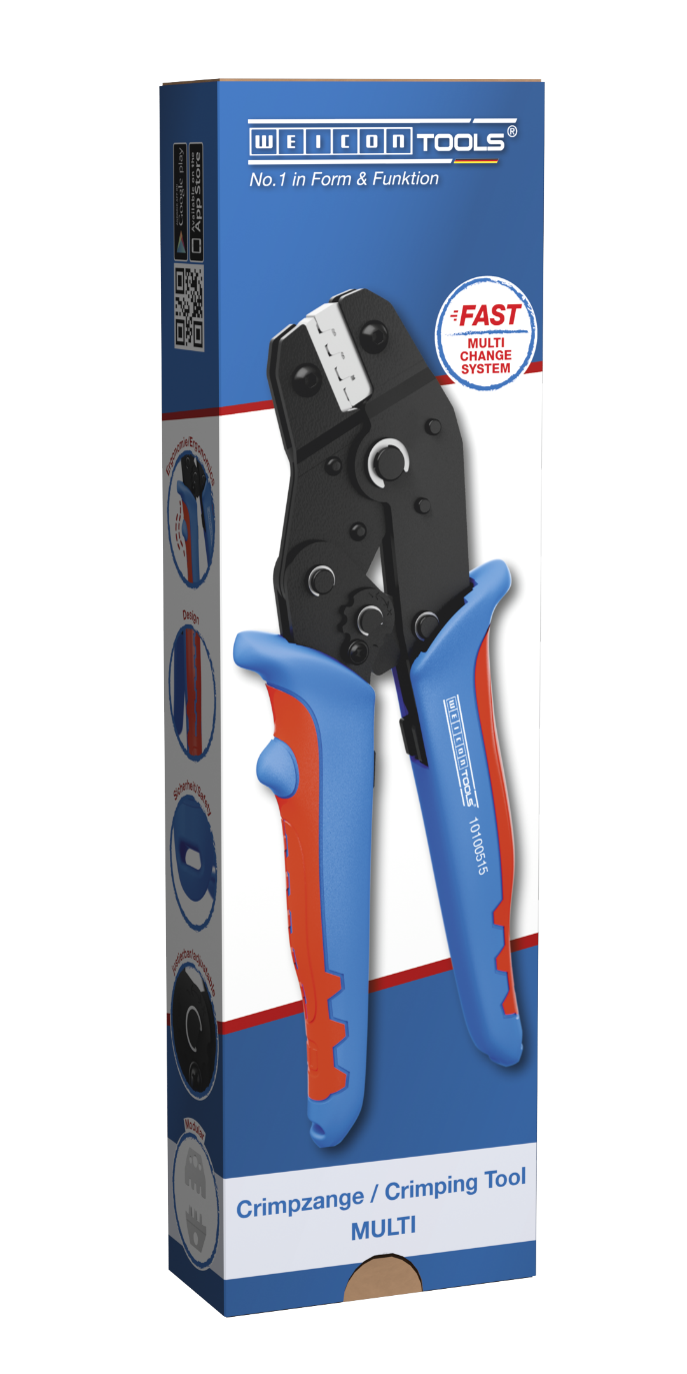 MULTI sıkma penseleri, çeşitli elektrik konnektörlerinin güvenilir bir şekilde sıkılması için geliştirilmiştir. Pense, sürekli yüksek sıkma kalitesi ve tekrarlanabilir doğruluk için pozitif kilitli bir mandal mekanizmasına sahiptir. Mekanizma, penseyi yalnızca sıkma işlemi tamamlandıktan sonra açar. Sapa entegre bir acil durum serbest bırakma mekanizması da, yanlış kullanım durumunda penseyi tekrar açar. Hassas eksantrik ayarı, yüksek sıkma kalitesi için hassas bir şekilde ayarlanabilir sıkma kuvveti sağlar. Çoklu Değiştirme Sistemi, pense modül çiftlerinin gerektiğinde hızlı ve kolay bir şekilde değiştirilmesini sağlar. Aletsiz değiştirme işlemi, modüllerin hızlı bir şekilde takılıp çıkarılmasını sağlar. Sıkma pensesinin standart versiyonu, yüksek kaliteli çelikten yapılmış üç modül çiftiyle donatılmıştır. Bir çift, 2,5 mm², 4 mm² ve 6 mm² (14-10 AWG) kablo kesitlerine sahip MC4 konnektörler içindir. Bir diğer modül çifti 0,25-6 mm² (AWG 24-10) yalıtımlı kablo uç halkaları, üçüncü modül ise 0,25-2,5 mm² (AWG 24-14) yalıtımlı kablo pabuçları içindir. Üç modül çifti, küçük bir plastik kutuda güvenli ve toz geçirmez bir şekilde saklanır. MULTI sıkma pensesinin çift bileşenli sapları, maksimum güç aktarımıyla kaymaz ve ergonomik bir çalışma sağlar. Hoş bir his sağlayan kanıtlanmış "buz çatlağı tasarımı" kullanılmıştır. Saplardaki entegre halkalar, düşmeye karşı koruma cihazı takmak için kullanılır.